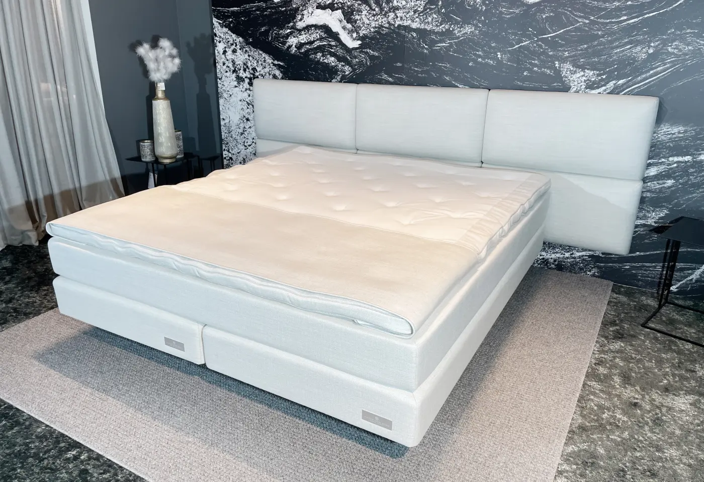 Das Boxspringbett Carpe Diem Skye Chalk vereint zeitlose Eleganz und höchsten Schlafkomfort in Ihrem Schlafzimmer. Mit seiner sanften Farbe Skye Chalk und der großzügigen Liegefläche von ca. 180x200 cm lädt es zum entspannten Träumen ein. Das edle Design und die sorgfältige Verarbeitung machen es zur perfekten Wahl für alle, die Qualität und Stil schätzen. Ob als Herzstück Ihres Rückzugsortes oder als stilvolle Lösung für erholsame Nächte – Skye Chalk bringt Wellnessgefühl ins eigene Zuhause. Erleben Sie dieses traumhafte Boxspringbett exklusiv bei Delta Möbel in Haag, Ihrem Experten für hochwertige Möbel und Wohnideen.