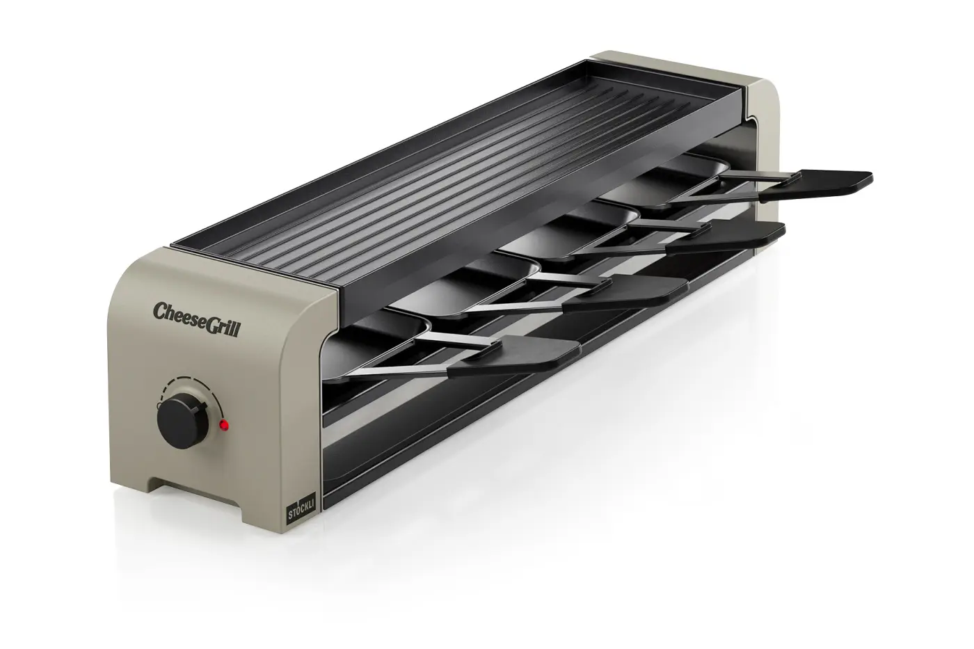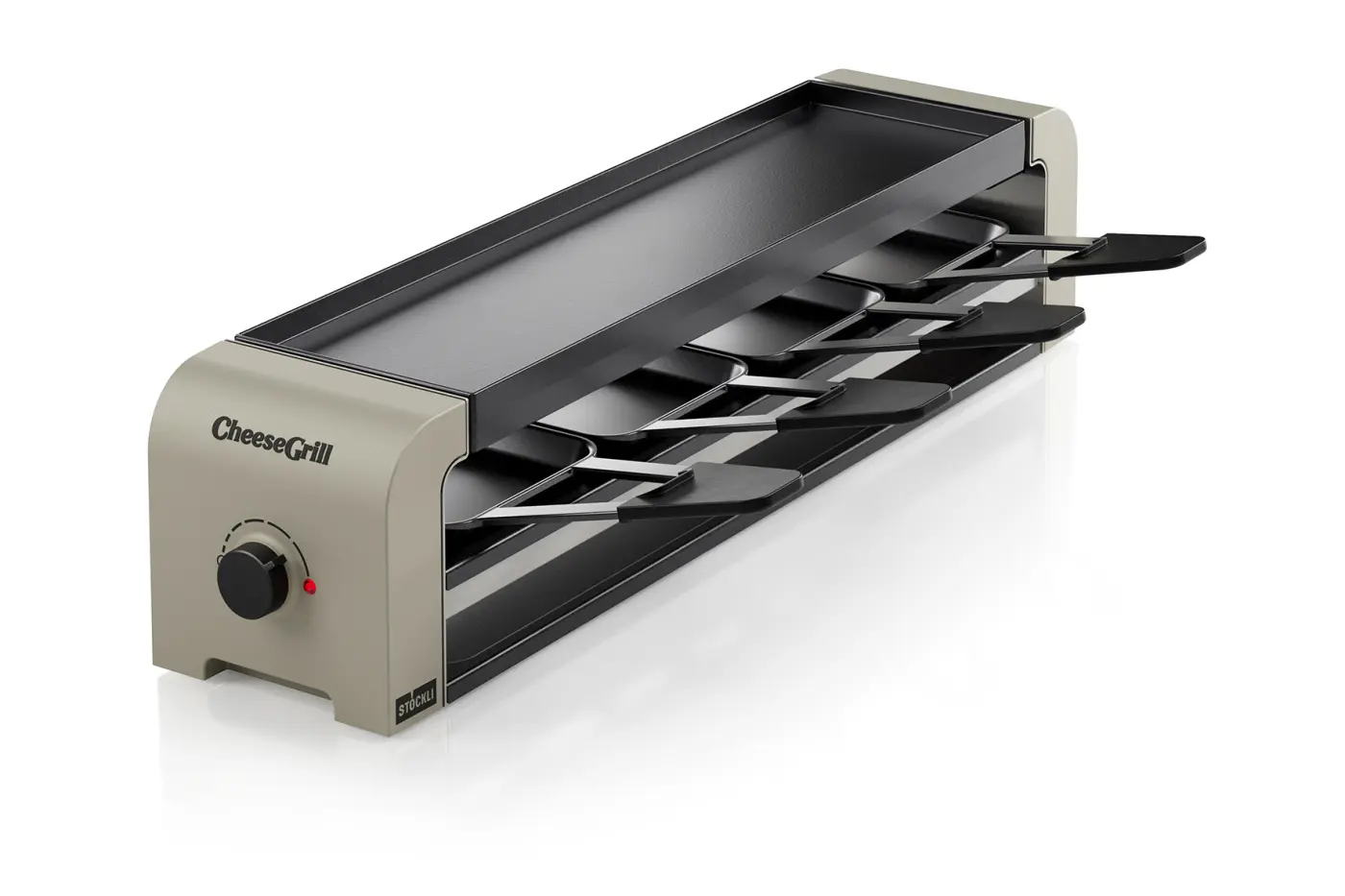Racletteofen, Wende-Grillplatte, 4 antihaftbeschichtete Pfännchen, 4 Kunststoff-Raclettespachteln