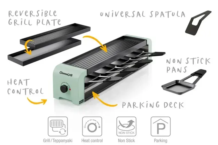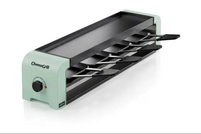 Racletteofen, Wende-Grillplatte, 4 antihaftbeschichtete Pfännchen, 4 Kunststoff-Raclettespachteln