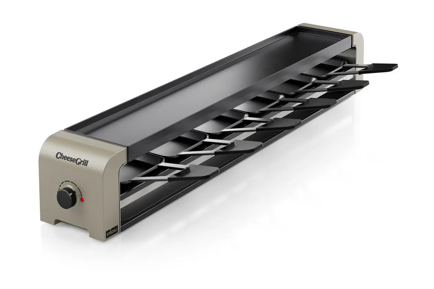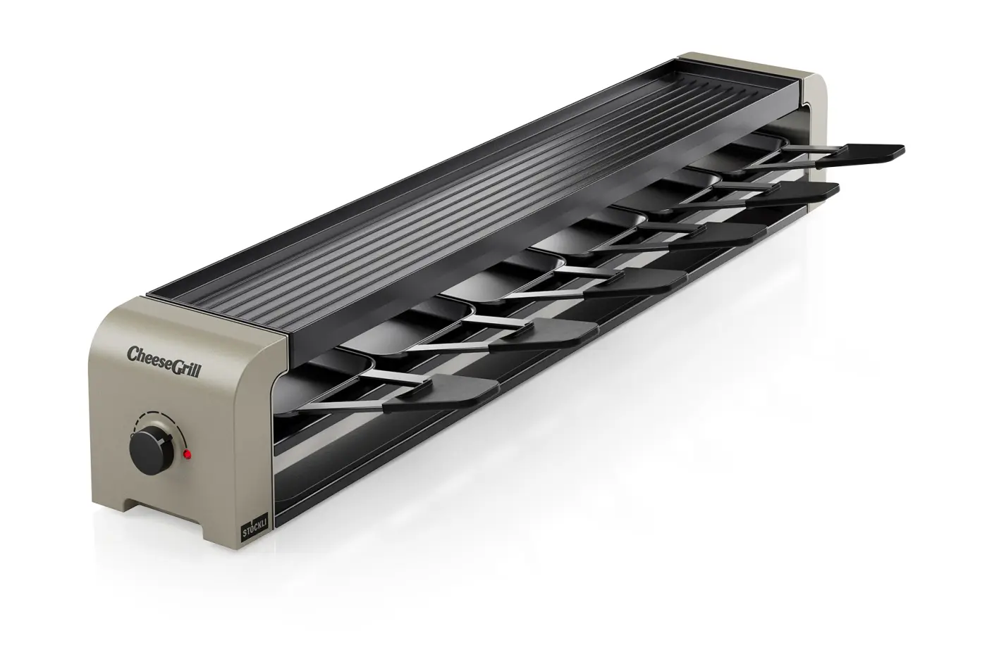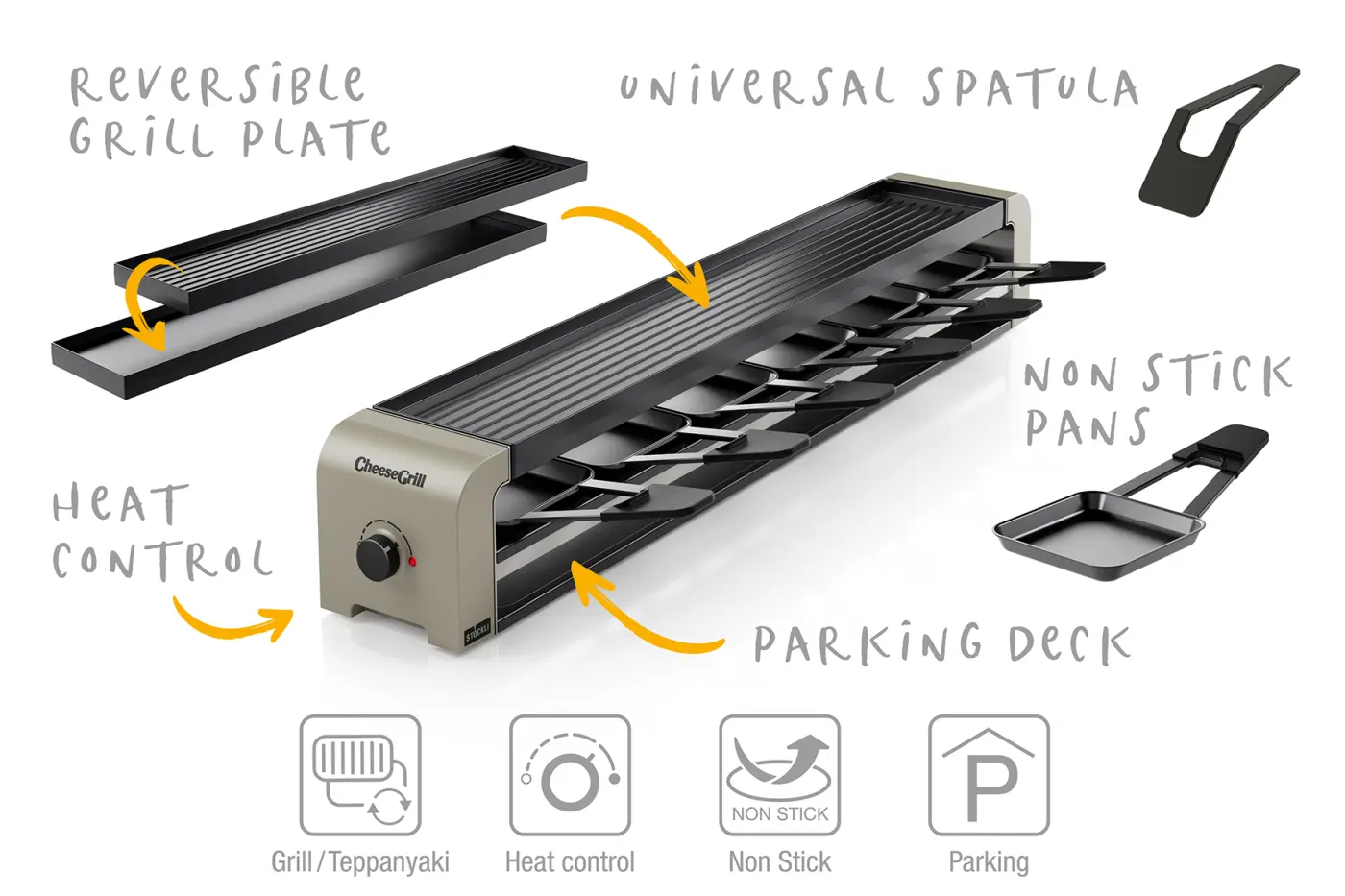 Stufenlos einstellbare Oberhitze, Wende-Grillplatte (Grillen/Teppanyaki), Praktisches Parkdeck für Pfännchen, Inklusive 6 Pfännchen & Spachteln,