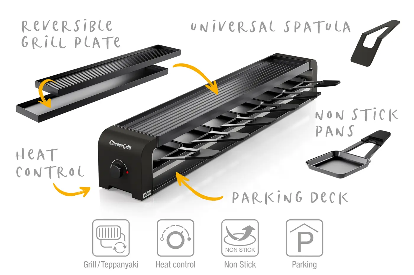 Stufenlos einstellbare Oberhitze, Wende-Grillplatte (Grillen/Teppanyaki), Praktisches Parkdeck für Pfännchen, Inklusive 6 Pfännchen & Spachteln,