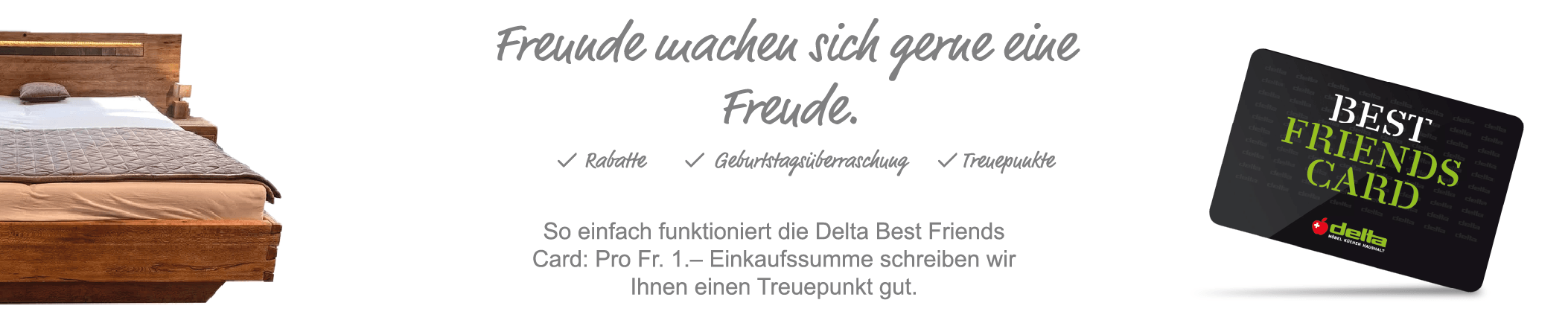 Delta Best Friends werden für jeden Einkauf bei Delta Möbel (ausgenommen Küchen, Elektrogeräte) mit Punkten belohnt. Die gesammelten Punkte können in Form eines Einkaufsgutscheins, der Ihnen einmal im Jahr zugesandt wird, eingelöst werden.