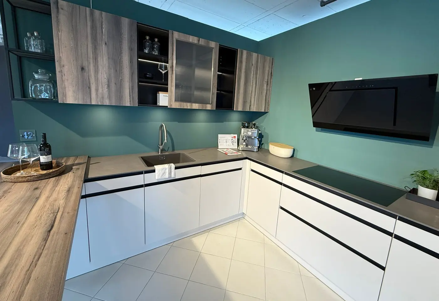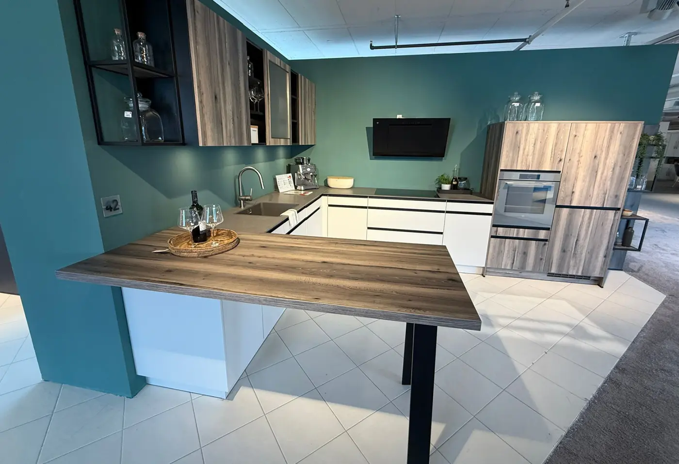 Die Einbauküche überzeugt mit einer stilvollen Kombination aus Muschelweiss, Virginia Eiche Nb und Onyxschwarz, ergänzt durch eine hochwertige Glasfront in glänzend und satiniert. Dieses edle Zusammenspiel von Materialien schafft eine warme und zugleich moderne Atmosphäre in deiner Küche. Als Austellungsstück bei Delta Möbel in Haag bietet diese Küche höchste Qualität und durchdachte Funktionalität – perfekt für alle, die Design und Komfort schätzen. Geniesse das besondere Wohngefühl mit einer Küche, die dein Zuhause bereichert!