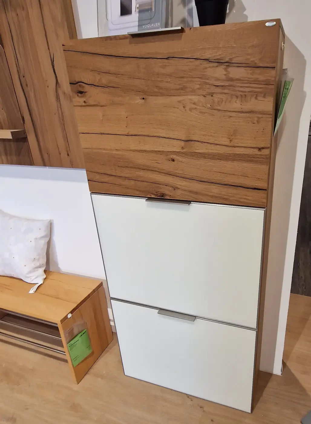 Die Garderobe V-Alpin von Voglauer verbindet natürliche Eiche mit klarem Weiß zu einem modernen Wohlfühlambiente im Eingangsbereich. Das Ensemble aus geräumigem Schuhschrank, Garderobenpaneel und Sitzbank bietet vielfältigen Stauraum und praktische Ablagen für Jacken, Schuhe und Accessoires. Mit ihrer hochwertigen Verarbeitung aus zertifizierter Eiche aus Deutschland und Frankreich bringt diese Garderobe Wärme und Eleganz in jedes Zuhause. Entdecken Sie die perfekte Kombination aus Funktionalität und Design exklusiv bei Delta Möbel in Haag – Ihrem Profi für Garderoben, Möbel und Küchen. So wird der Eingangsbereich zum stilvollen Empfang!