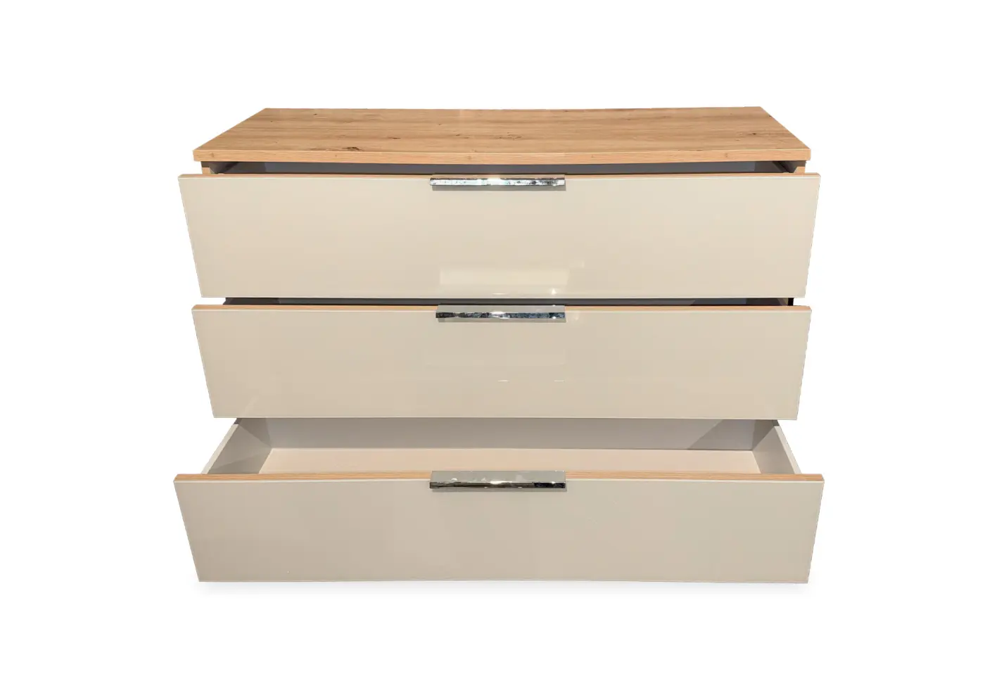 Die Grosskommode in Artisan Eiche mit eleganter Sandglas-Front bringt zeitlose Natürlichkeit in Ihr Zuhause. Mit drei geräumigen Schubladen und chromfarbenen Griffleisten bietet sie praktischen Stauraum und schlichte Eleganz zugleich. Die Kombination aus Holzdekor und sandglasfarbener Front macht das Möbelstück zum stilvollen Highlight im Wohn- oder Schlafbereich. Entdecken Sie diese hochwertige Kommode exklusiv bei Delta Möbel in Haag – Ihrem Partner für Möbel, Küchen und Boutique-Artikel mit vielfältigem Sortiment. Bringen Sie mit dieser Kommode warme Akzente und funktionales Design in jeden Raum!