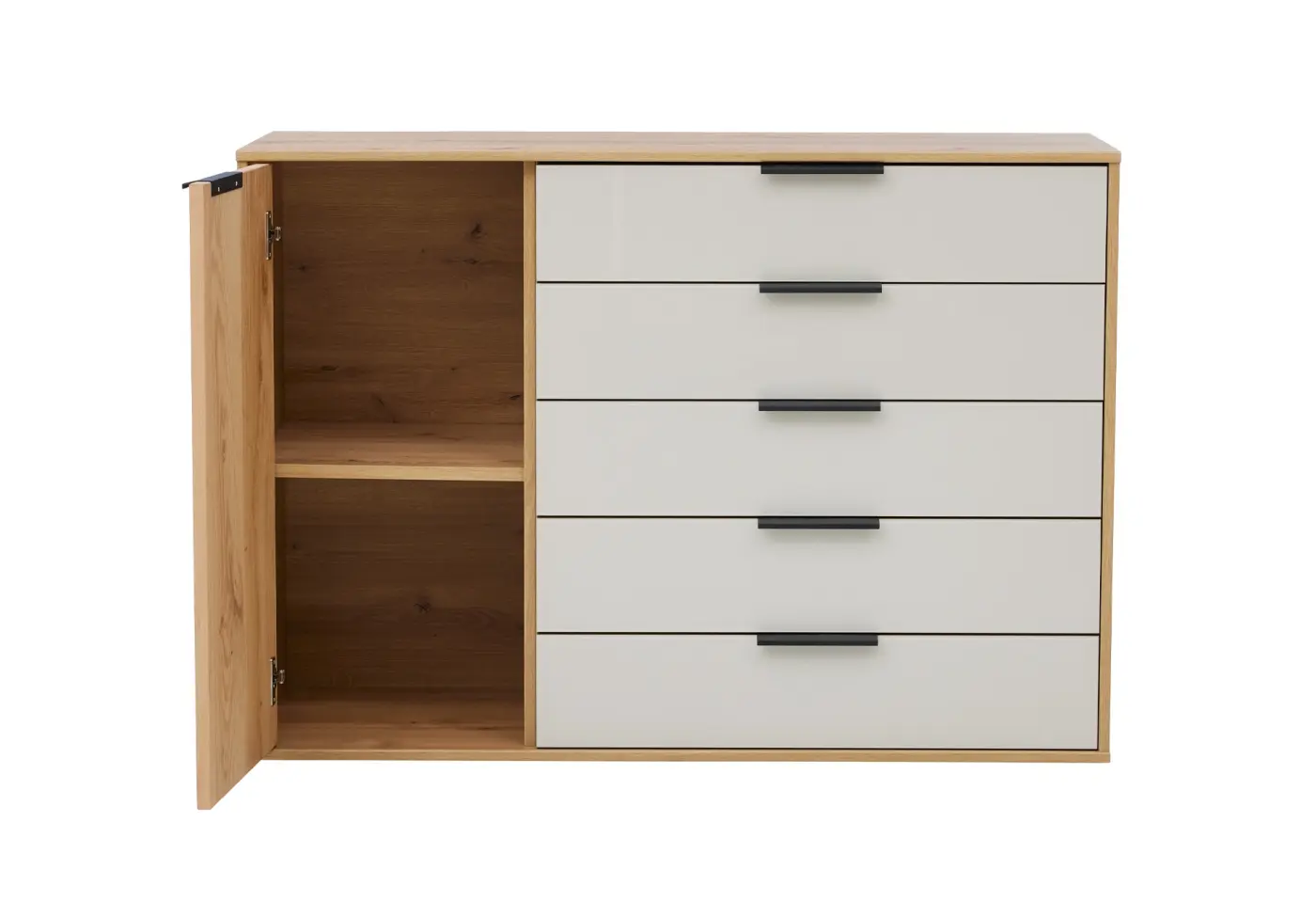 Die Kombikommode 1034 von Interliving verleiht deinem Schlafzimmer mit der liebevoll gestalteten Bianco-Eiche-Nachbildung einen Hauch natürlicher Eleganz. Die Front aus champagnerfarbenem Glas setzt glänzende Akzente und macht die Kommode zum stilvollen Blickfang. Mit ihren großzügigen Schubladen und dem praktischen Türfach schafft sie viel Stauraum für deine Lieblingsstücke. Ob als Ergänzung zum passenden Schlafzimmer oder als modernes Sideboard im Wohnbereich - dieses Möbelstück verbindet Funktionalität und zeitloses Design perfekt. Entdecke die Kombikommode exklusiv bei Delta Möbel in Haag, deinem Experten für hochwertige Möbel, Küchen und Wohnaccessoires.