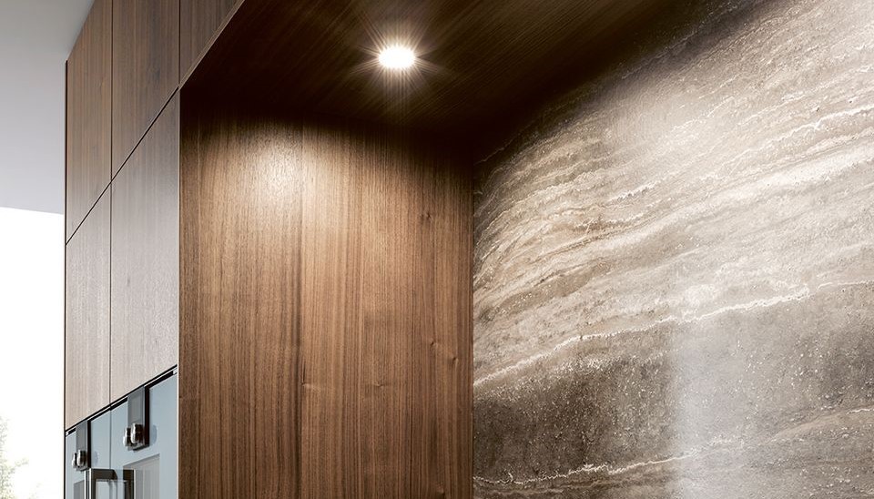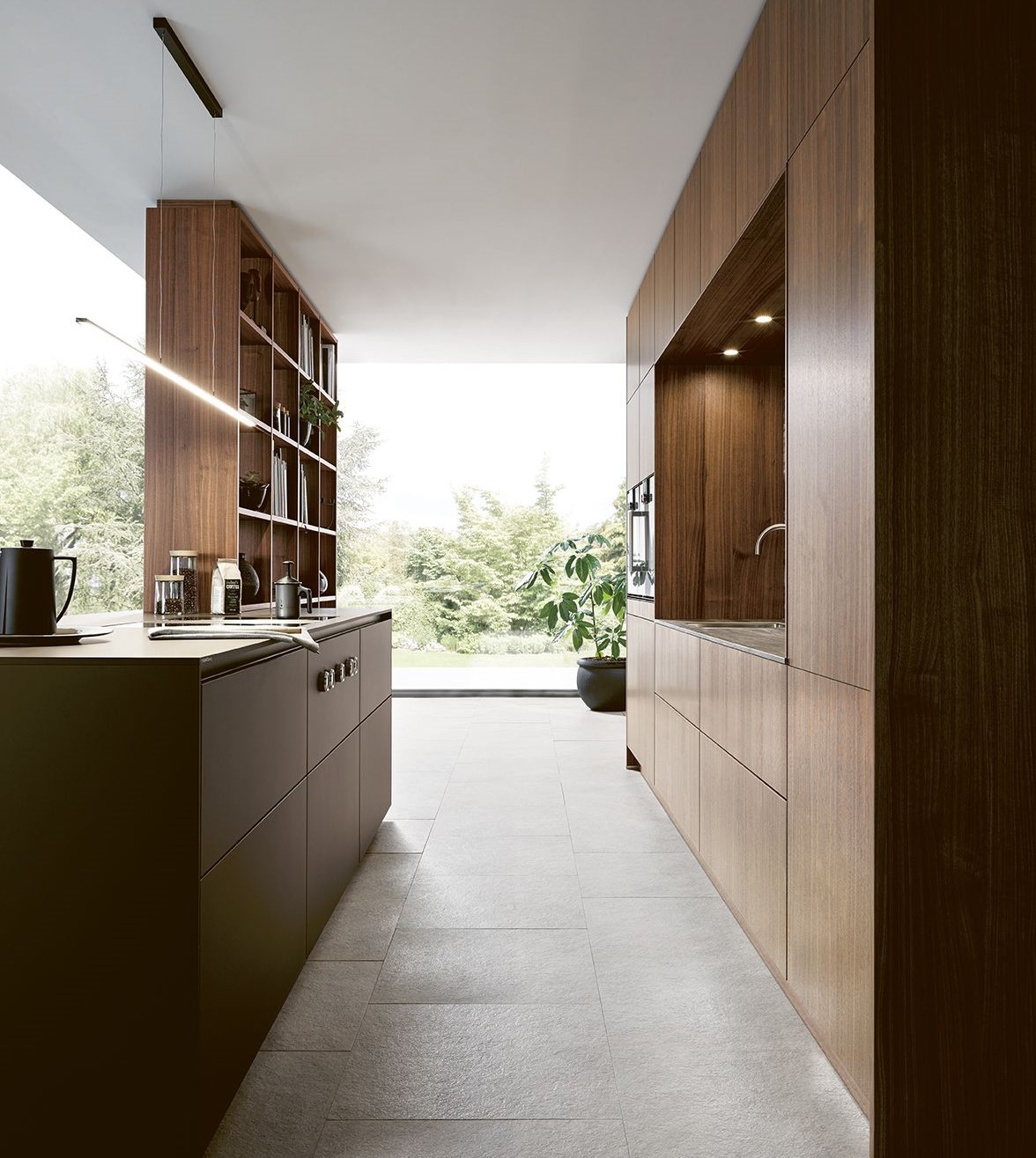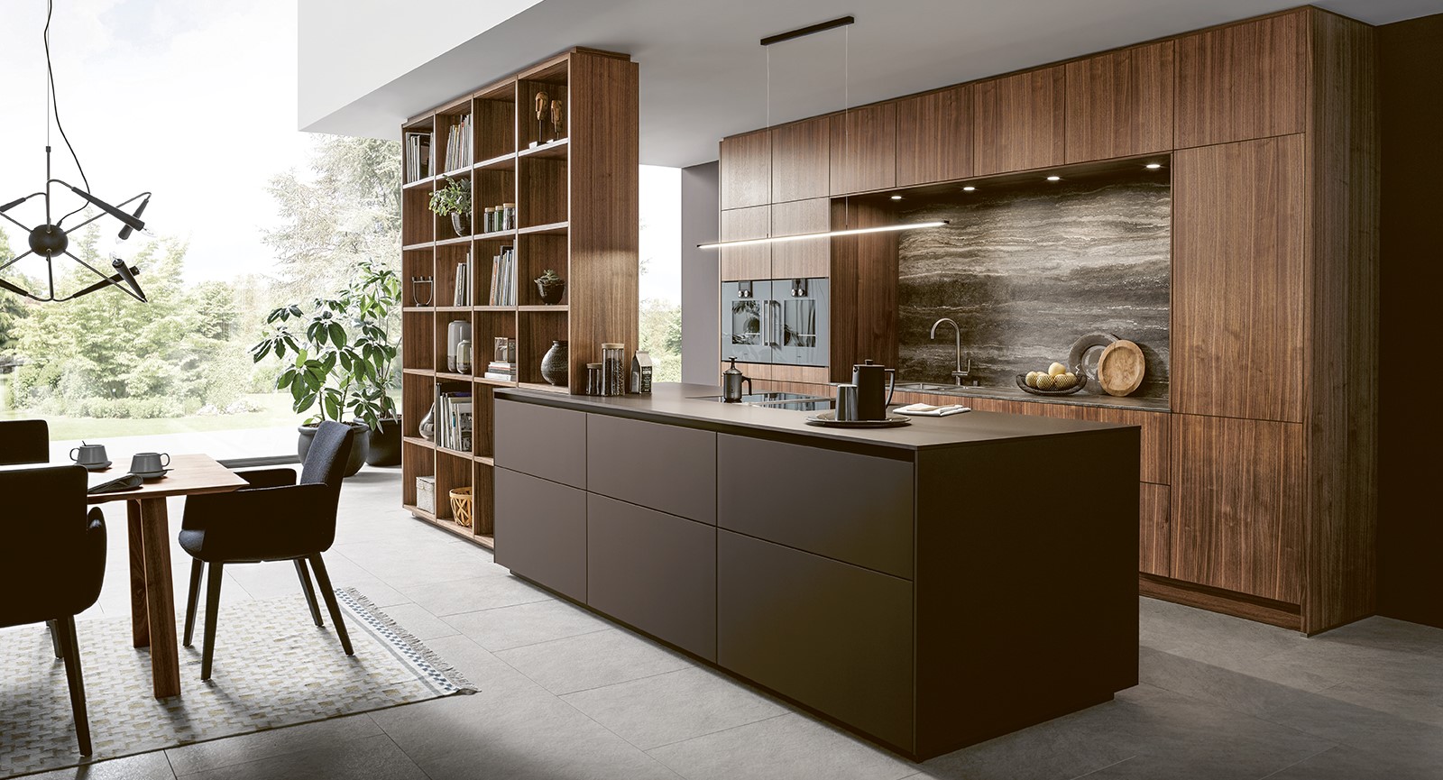Das beidseitig offene Regal als Raumelement unterstreicht den Wohncharakter auf subtile Art und ist gleichzeitig Brücke zwischen Kochen und Speisen. Der gezielte Einsatz des innovativen Schichtstoffmaterials SensiQ in Mokkabraun mit seiner pflegefreundlichen Anti-Fingerprint-Eigenschaft und Ceramicelemente als Nische und Arbeitsplatte, mutet besonders ruhig an. Die bewusste Frontgestaltung in Nussbaum natur und der Verzicht auf Griffe (möglich durch eine integrierte TIP-ON Ausstattung) verstärken den wohnlichen Charakter.
