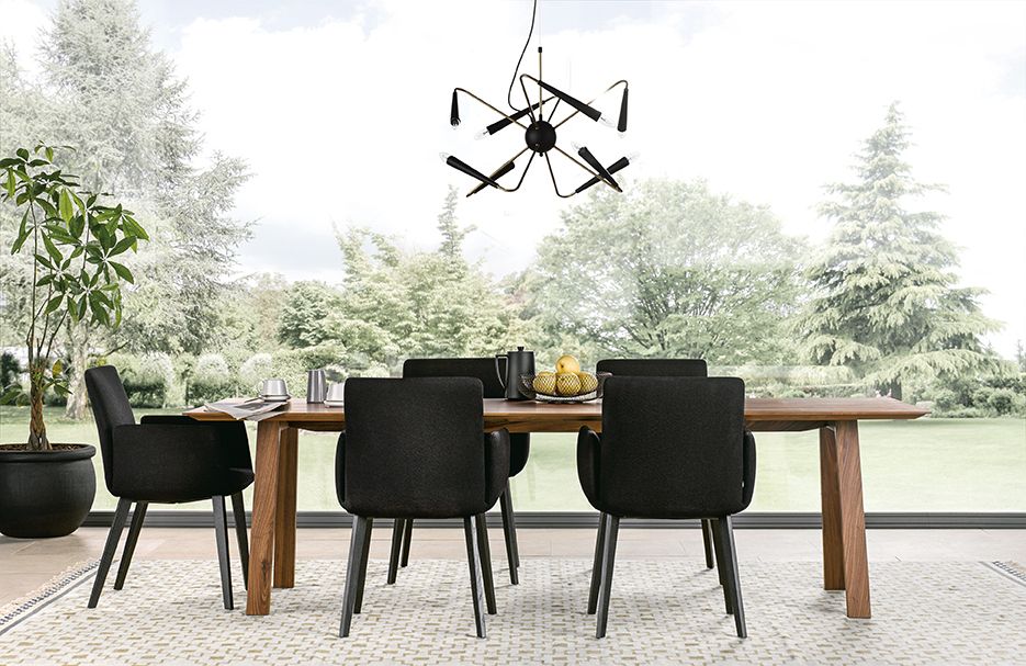 Gebaut in ausdrucksstarker Klarheit, bildet er eine homogene Einheit mit der Küche. Der Tisch in massiven, naturbelassenen Hölzern unterstreicht die Formensprache.