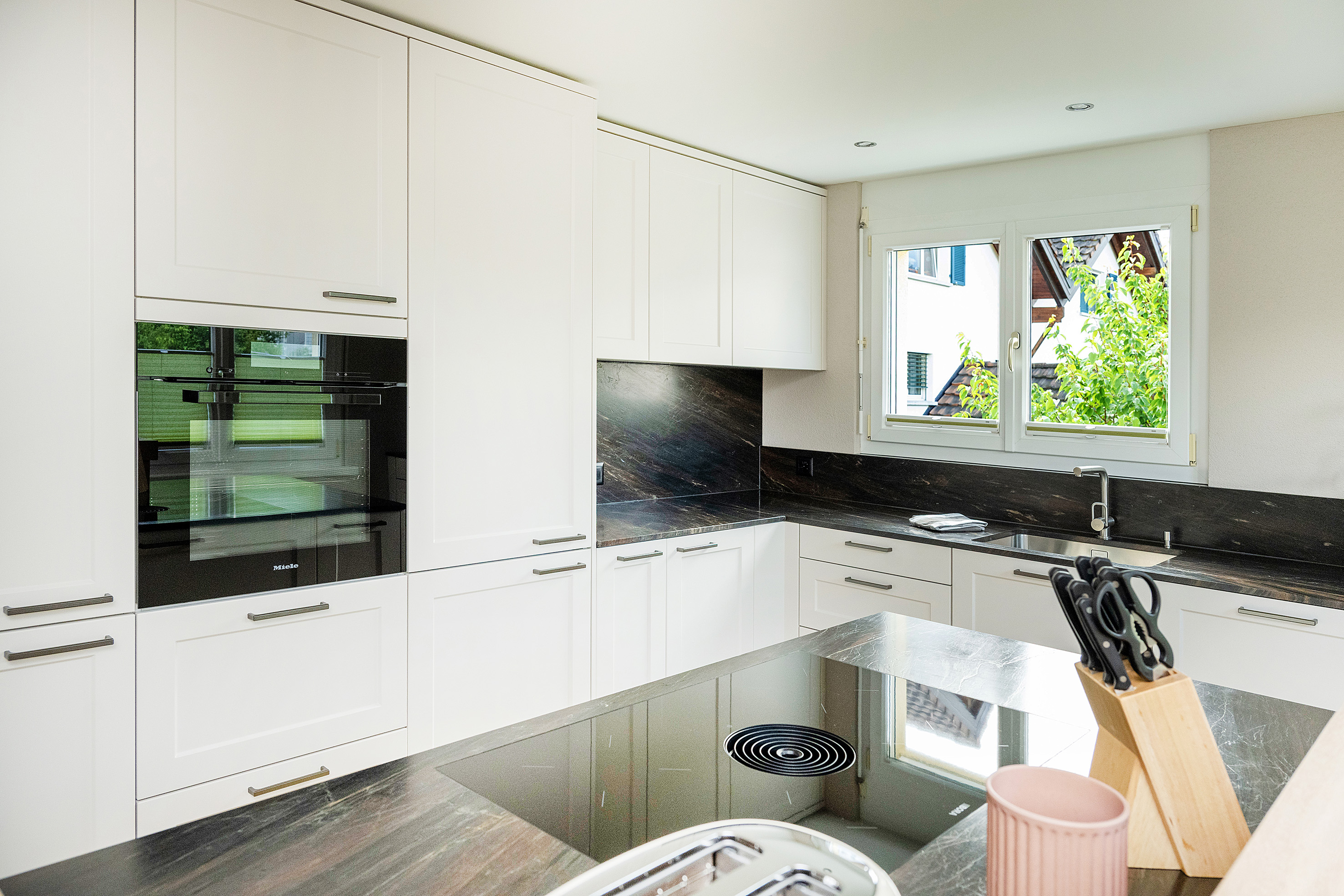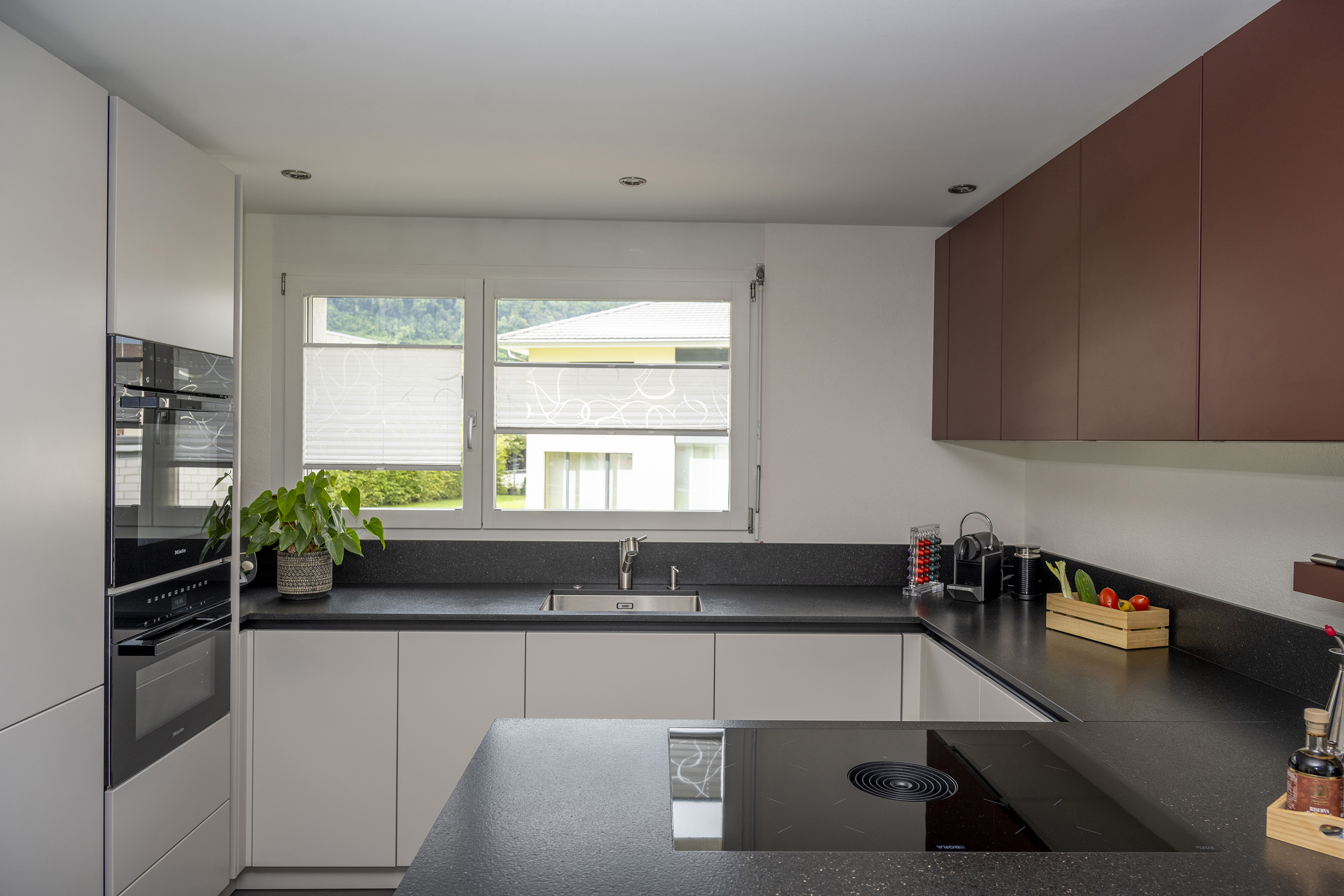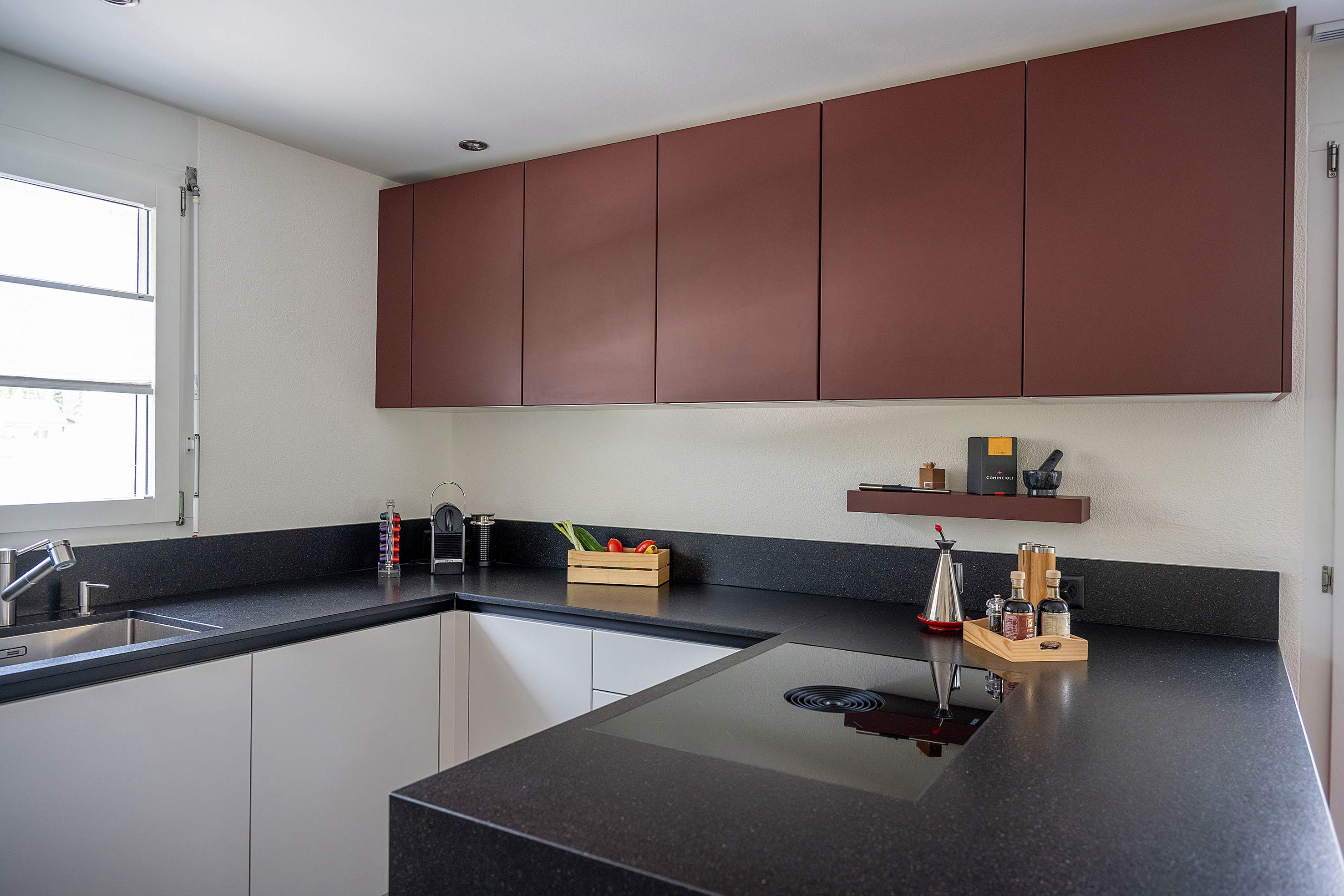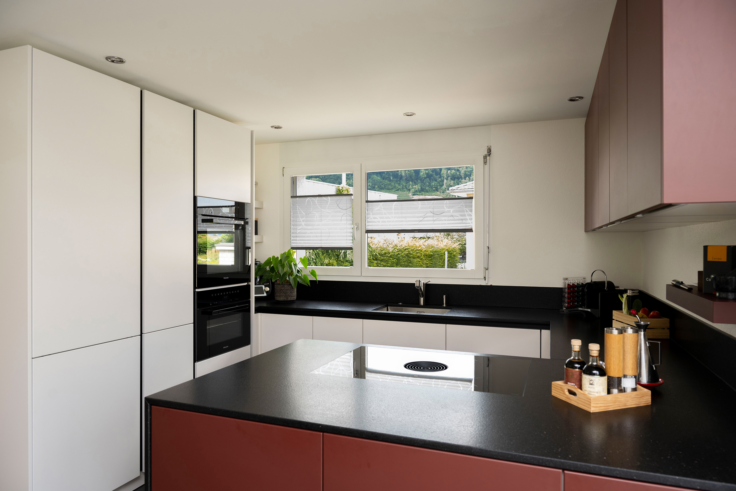 Diese moderne Küche verbindet klare Linien mit funktionalem Design und schafft so eine einladende Atmosphäre zum Kochen und Wohlfühlen. Die Kombination aus elegantem mattem Weiss und warmen, dunklen Fronten bringt Harmonie und Stil in jeden Raum.