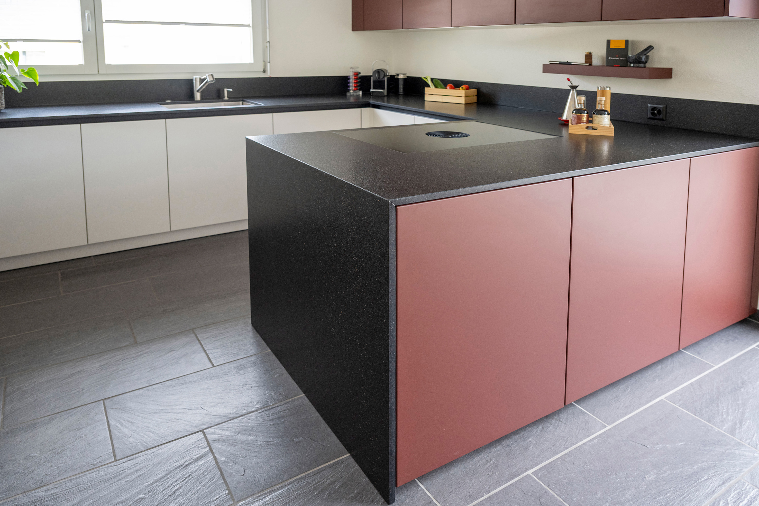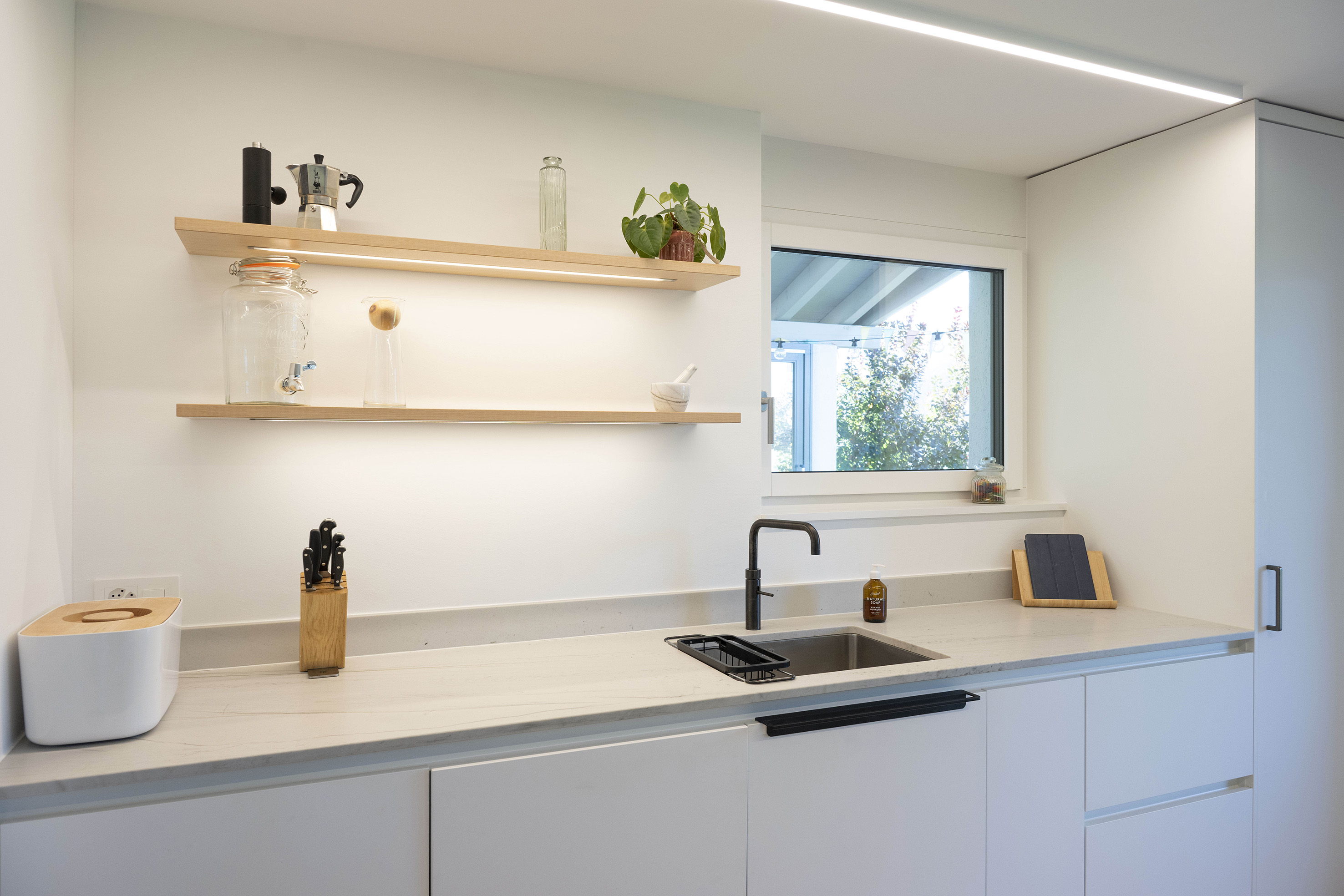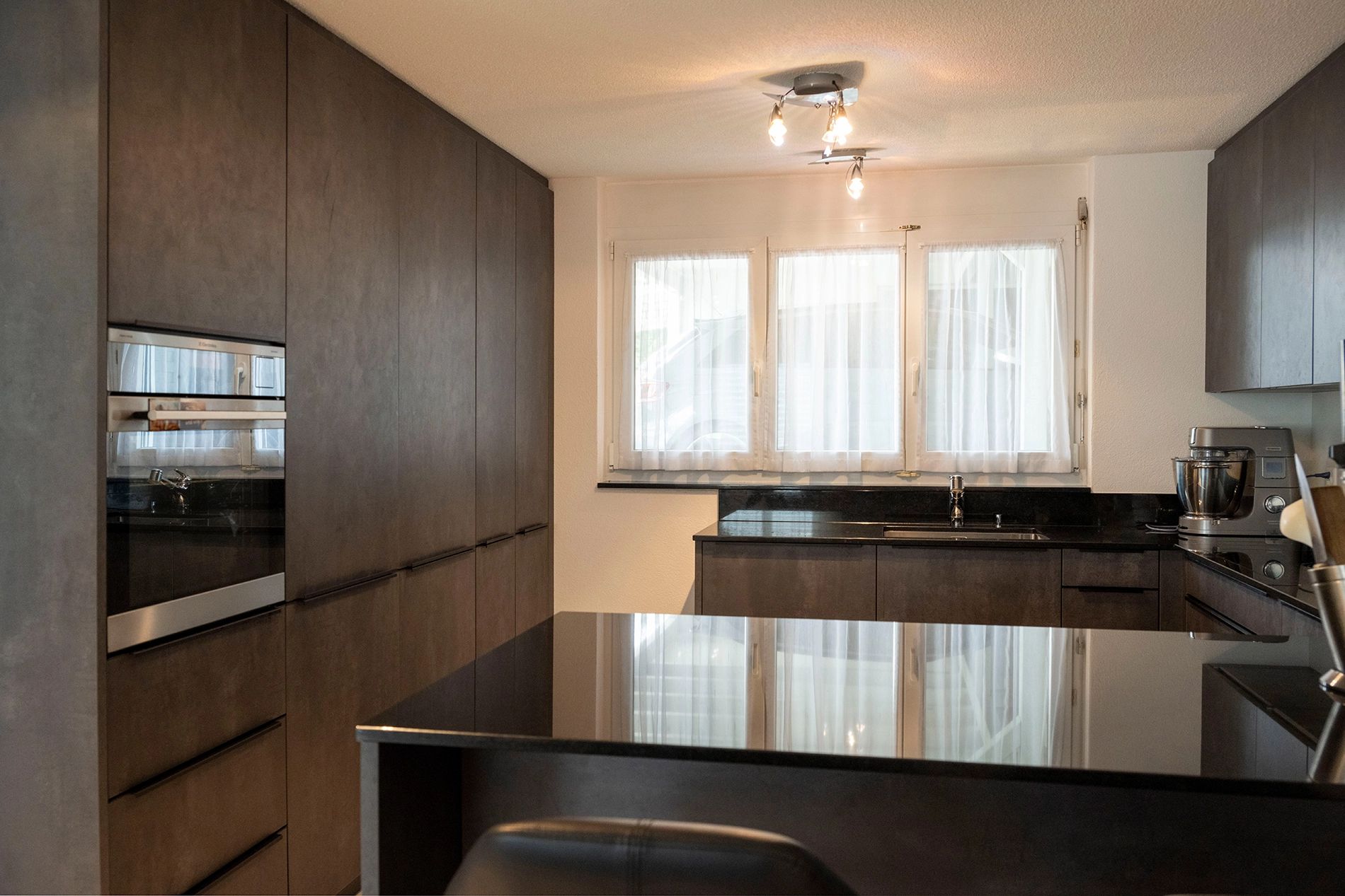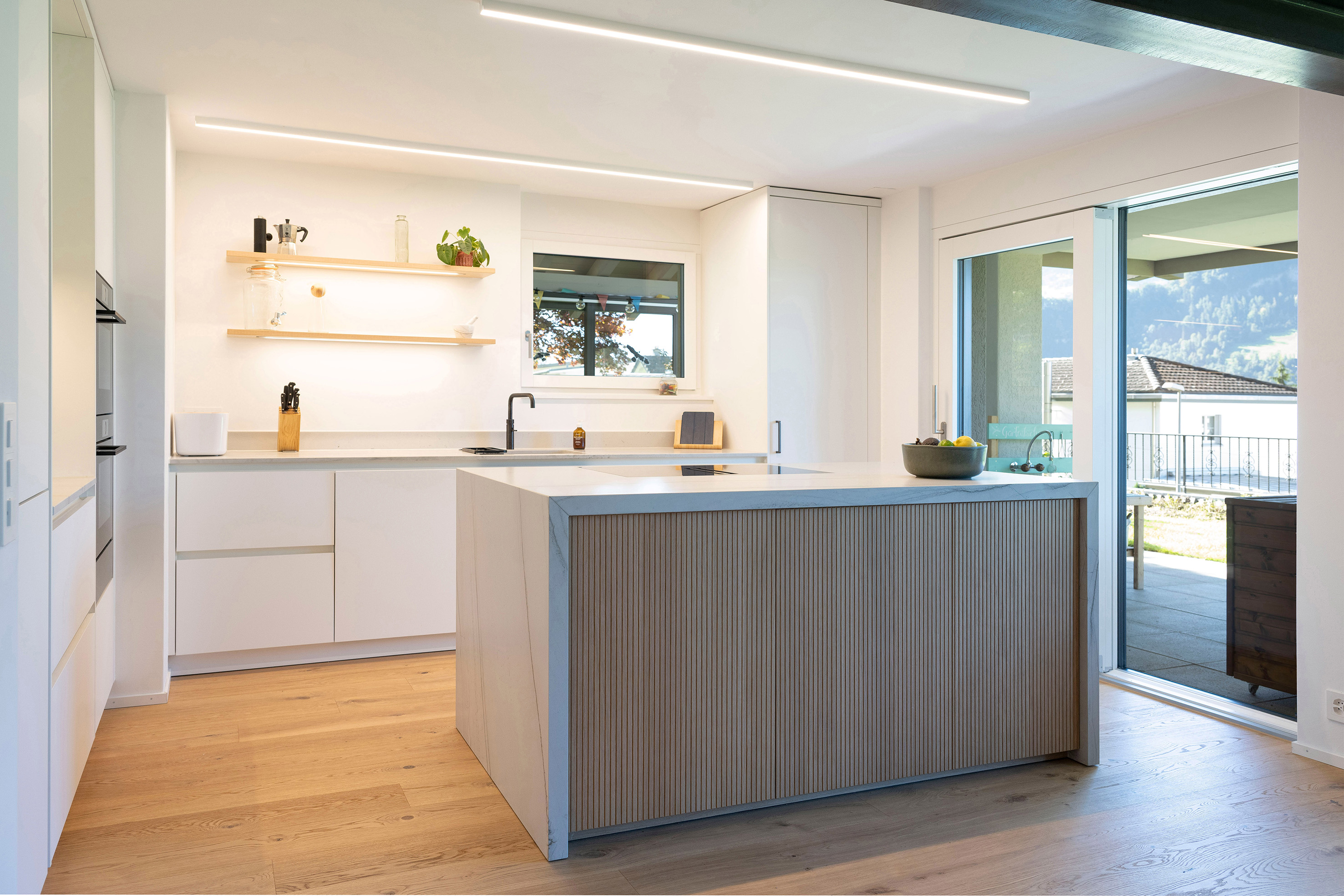 Diese moderne Küche verbindet klare Linien mit funktionalem Design und schafft so eine einladende Atmosphäre zum Kochen und Wohlfühlen. Die Kombination aus elegantem mattem Weiss und warmen, dunklen Fronten bringt Harmonie und Stil in jeden Raum.