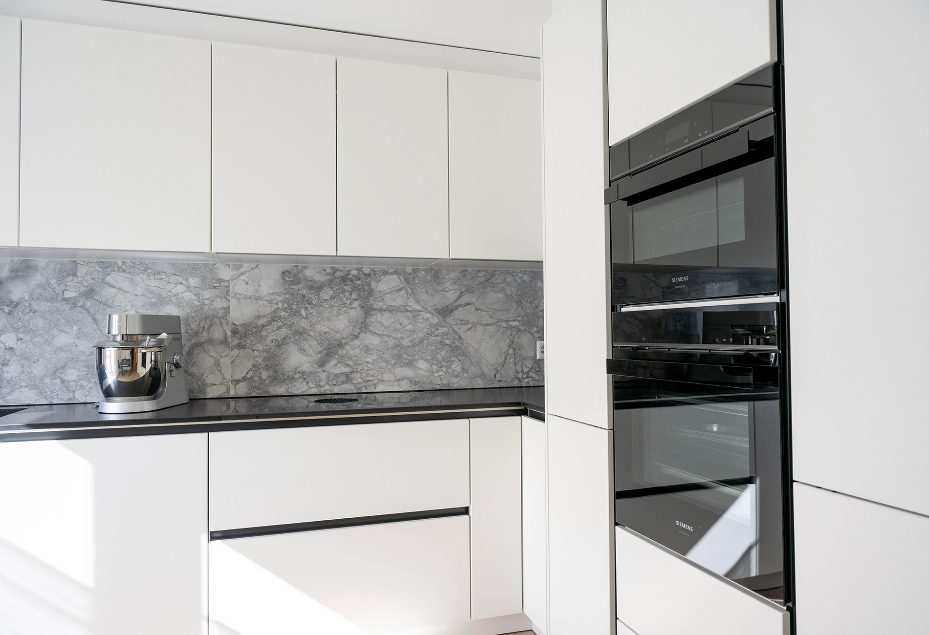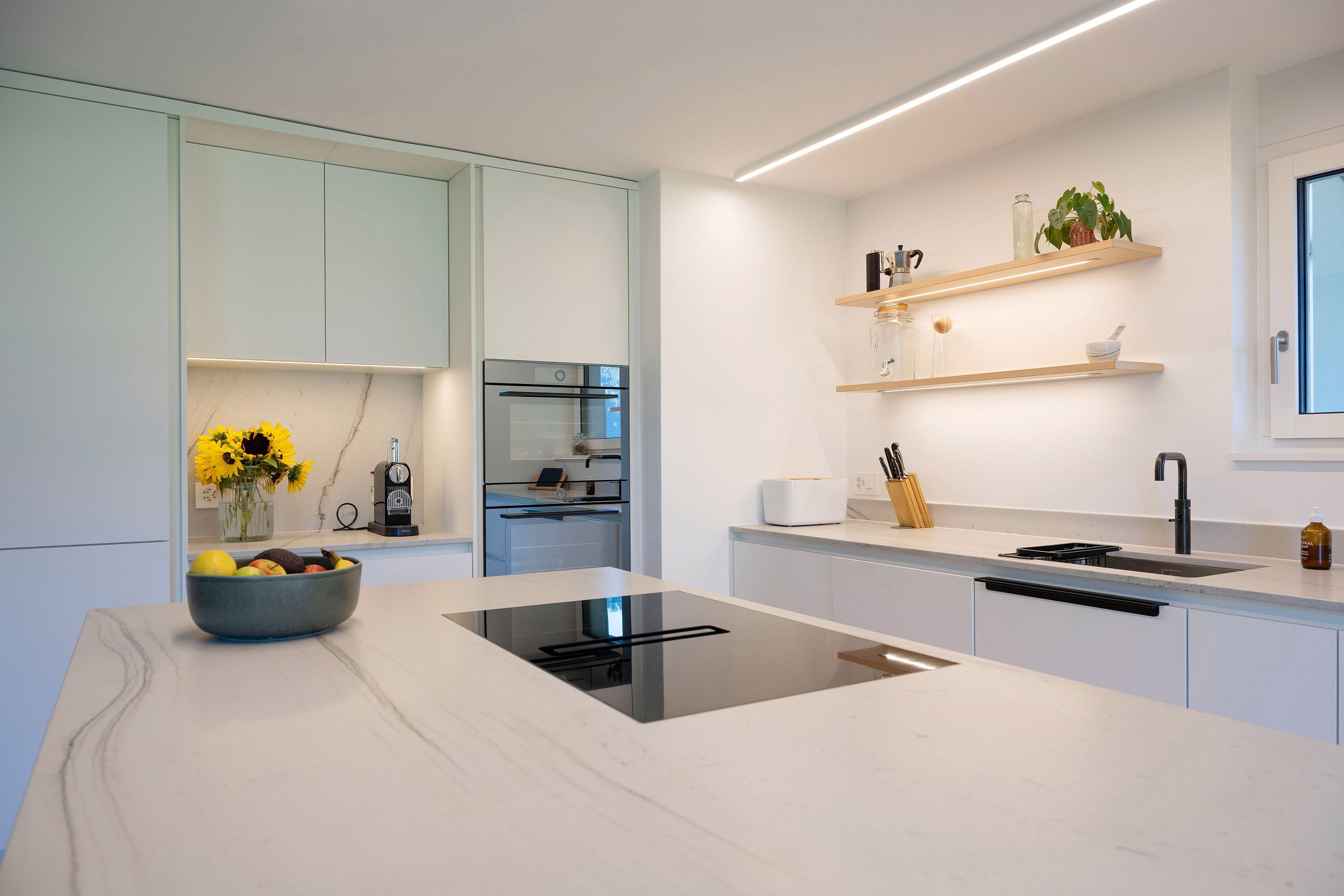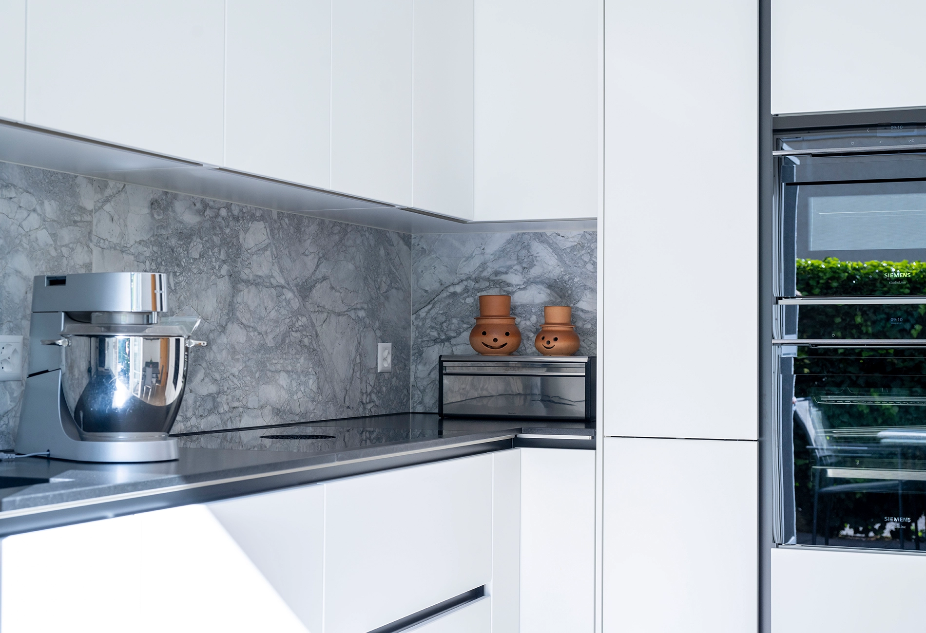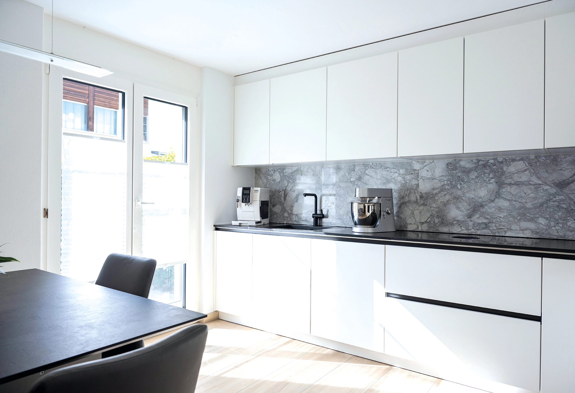 Diese Küche besticht durch klare, weisse Fronten und eine elegante Marmoroptik an der Wand, die für eine helle und moderne Atmosphäre sorgt.