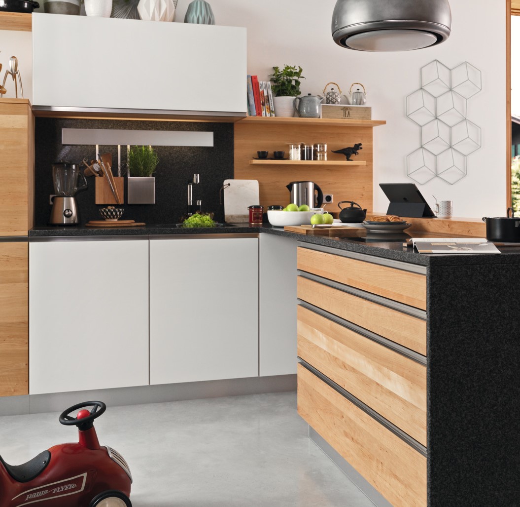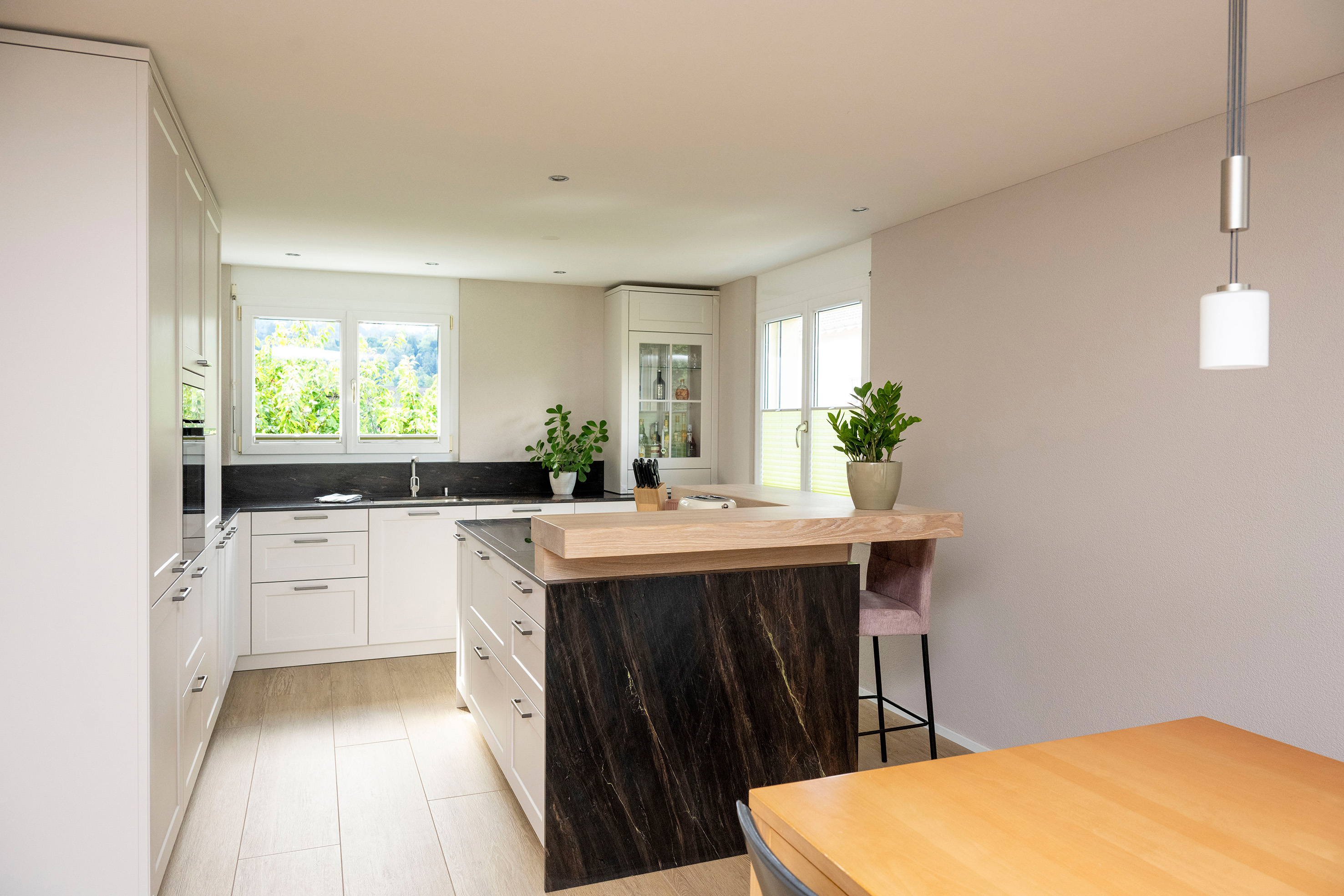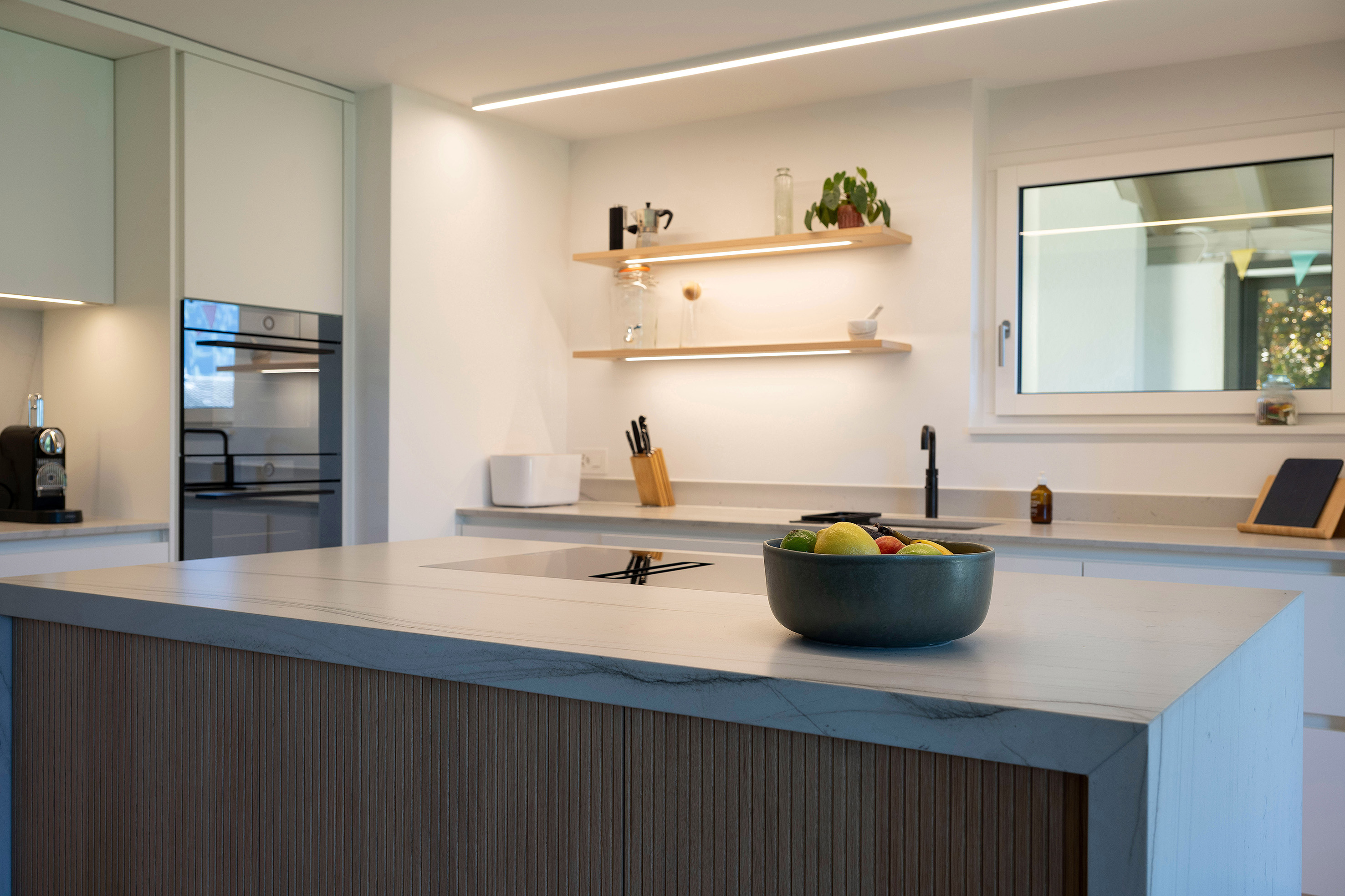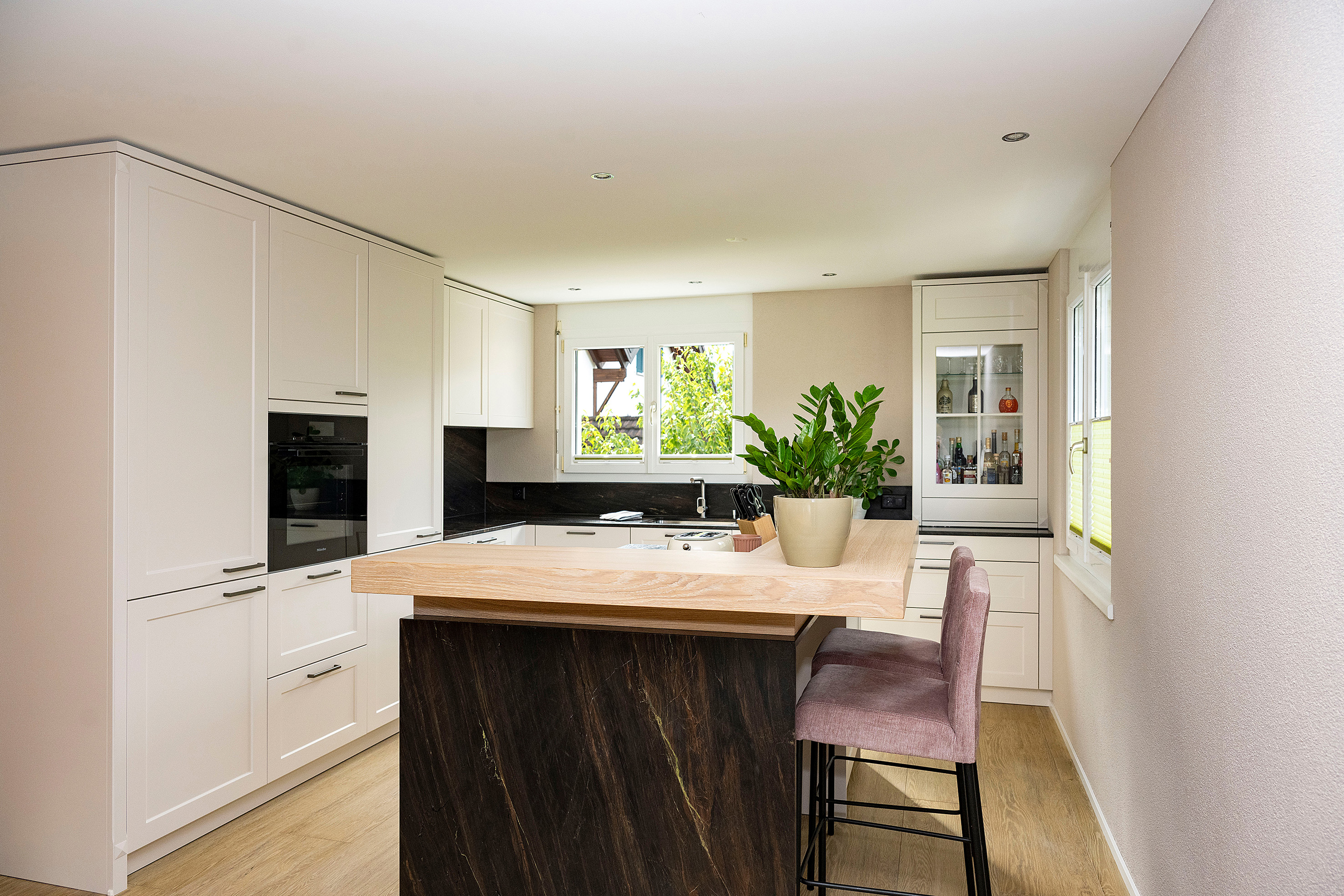 Diese Küche verbindet warme Holzakzente mit einer eleganten, hellen Farbgebung. Die grosszügige Insel und die offenen Regale schaffen ein harmonisches Zusammenspiel aus Design und Funktion.