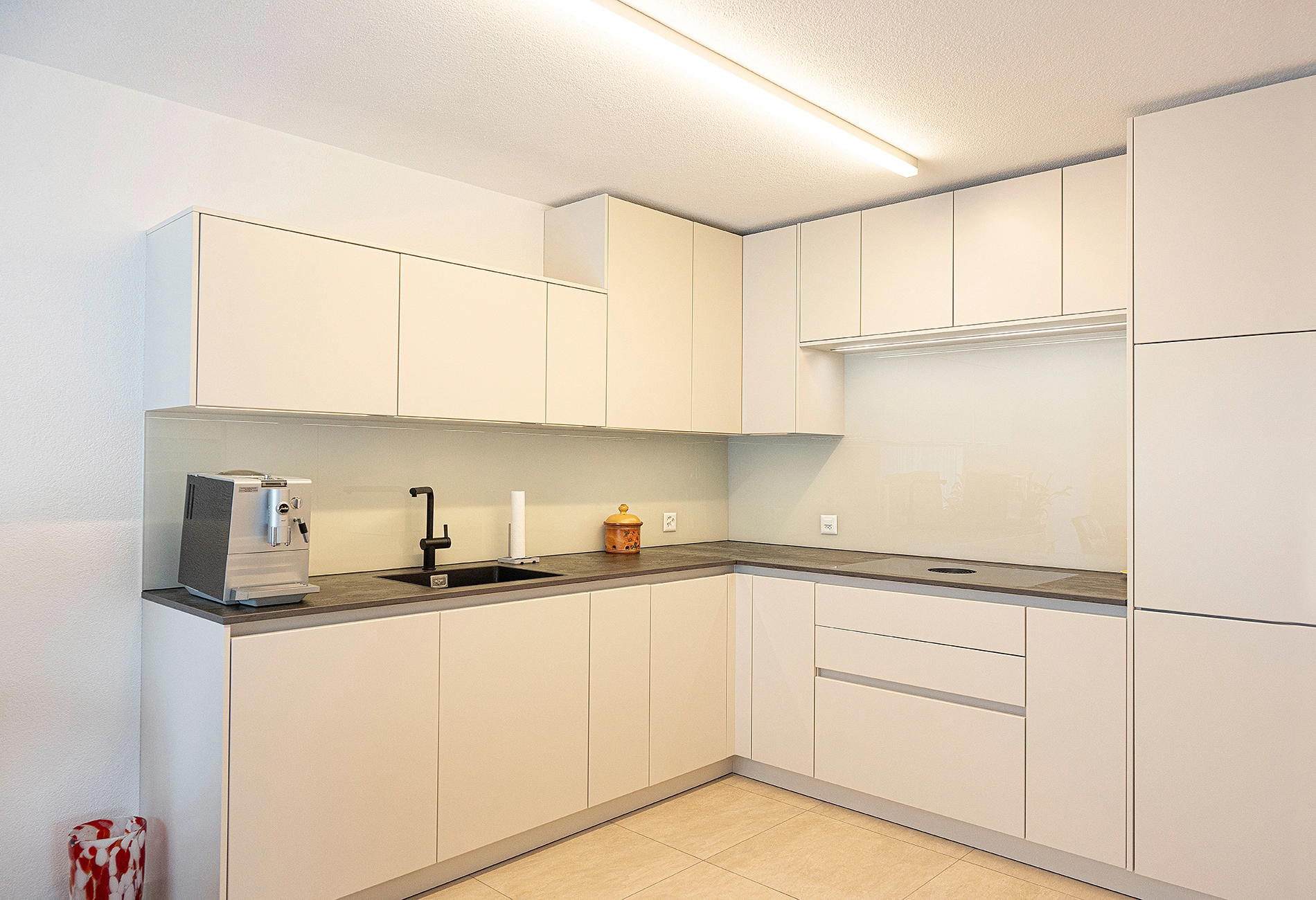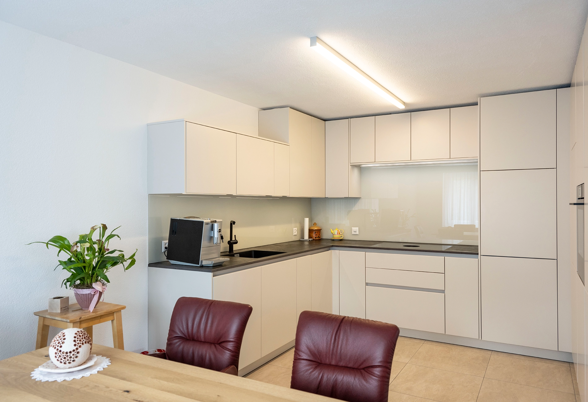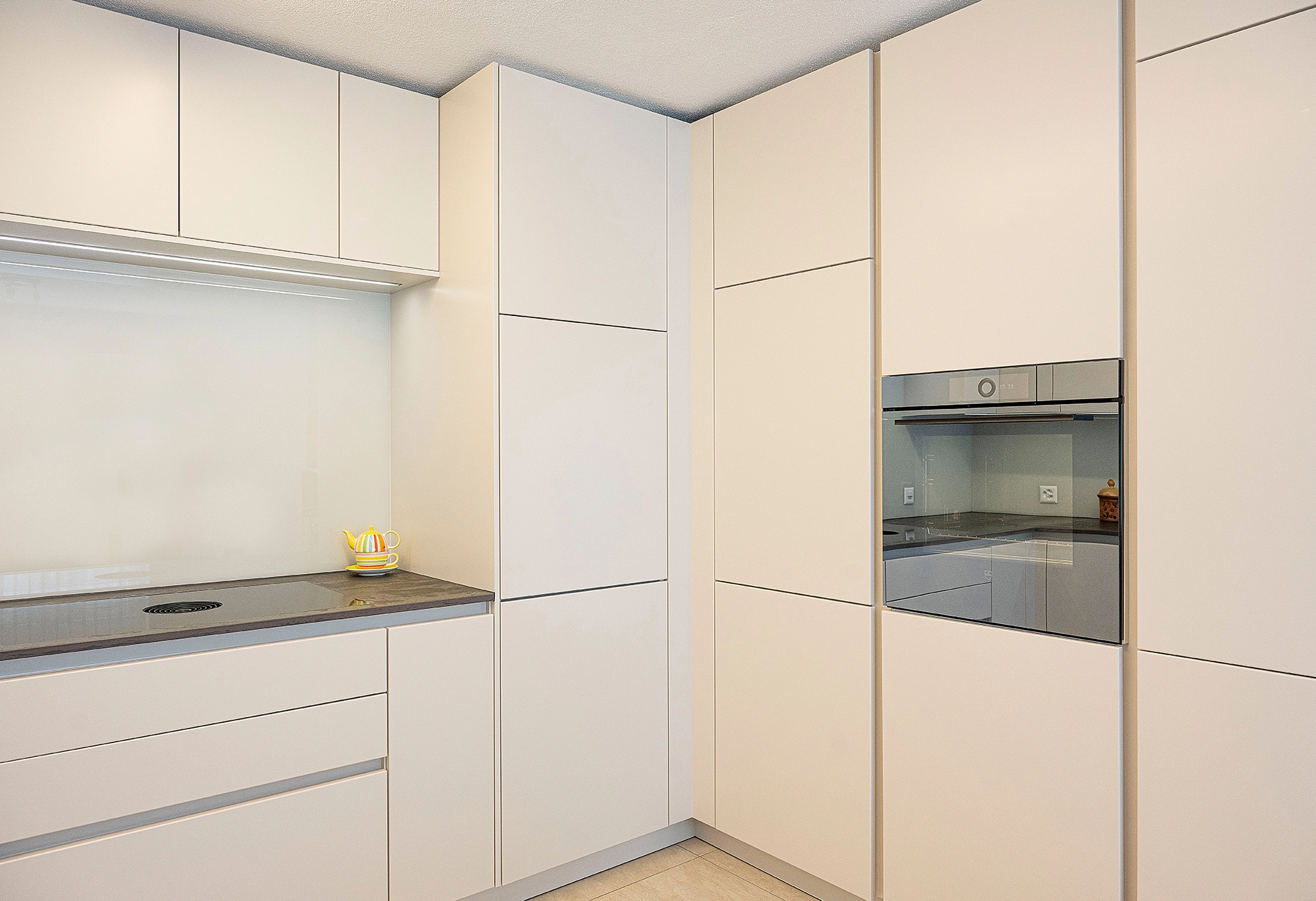 Diese Küche überzeugt mit matten, hellen Fronten und einer dezenten, grauen Arbeitsplatte. Ihre klare Linienführung und die geschickte Raumnutzung schaffen eine angenehme und moderne Atmosphäre.