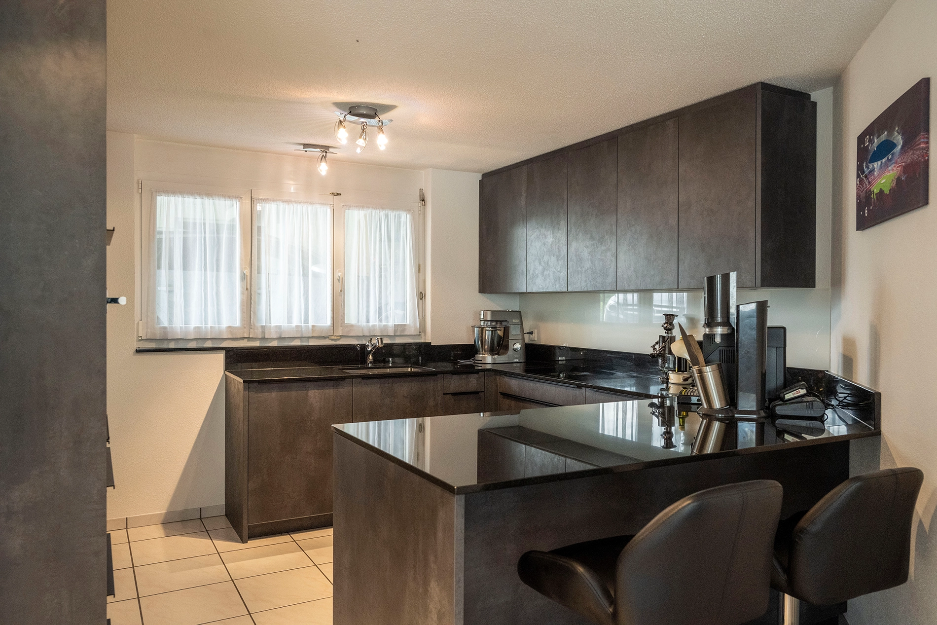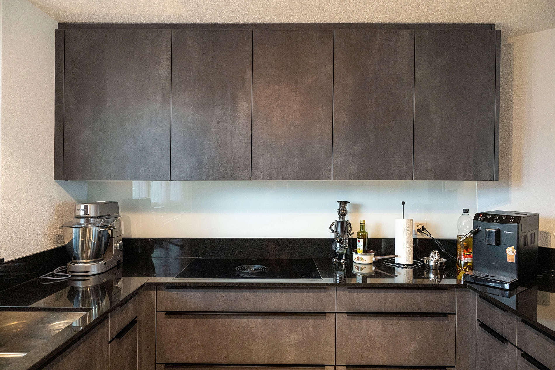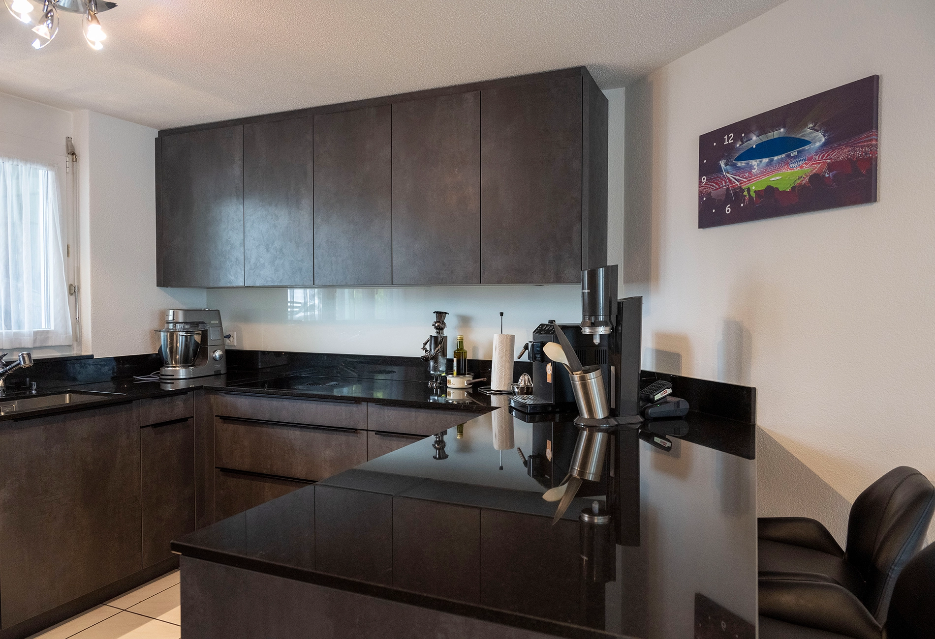 Diese moderne Küche kombiniert elegante, dunkle Fronten mit einer glänzenden Arbeitsplatte und schafft so eine zeitlose Atmosphäre.