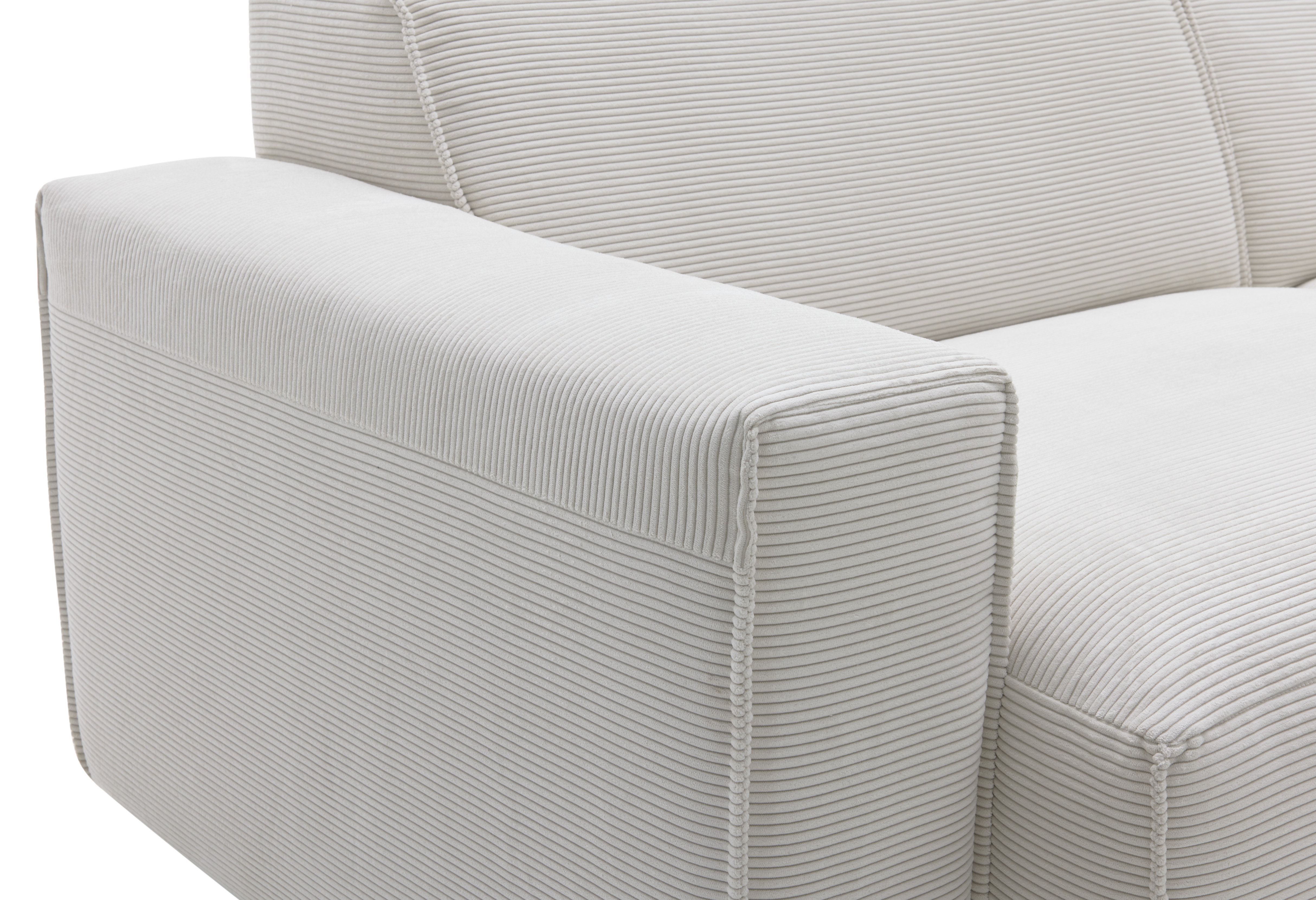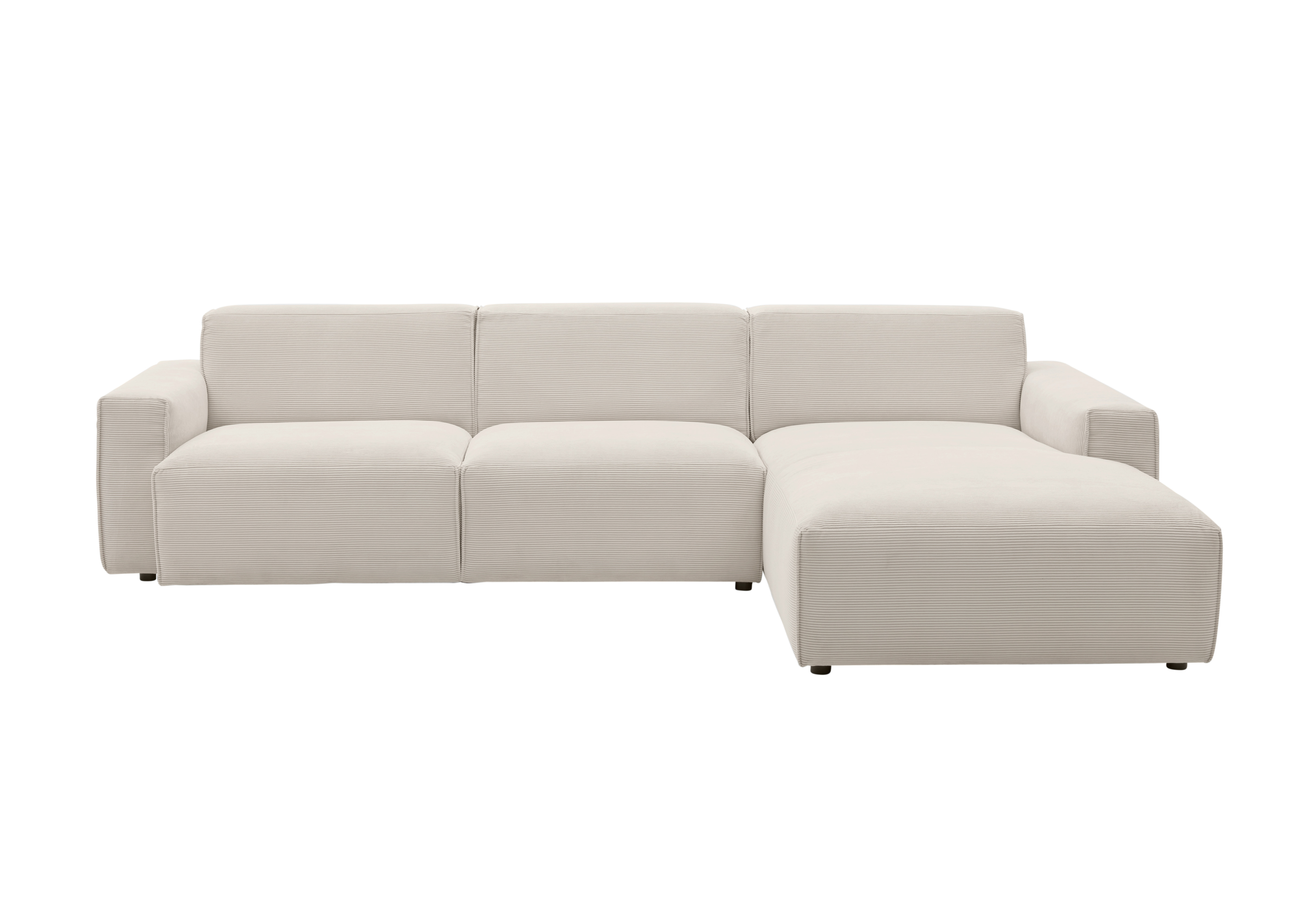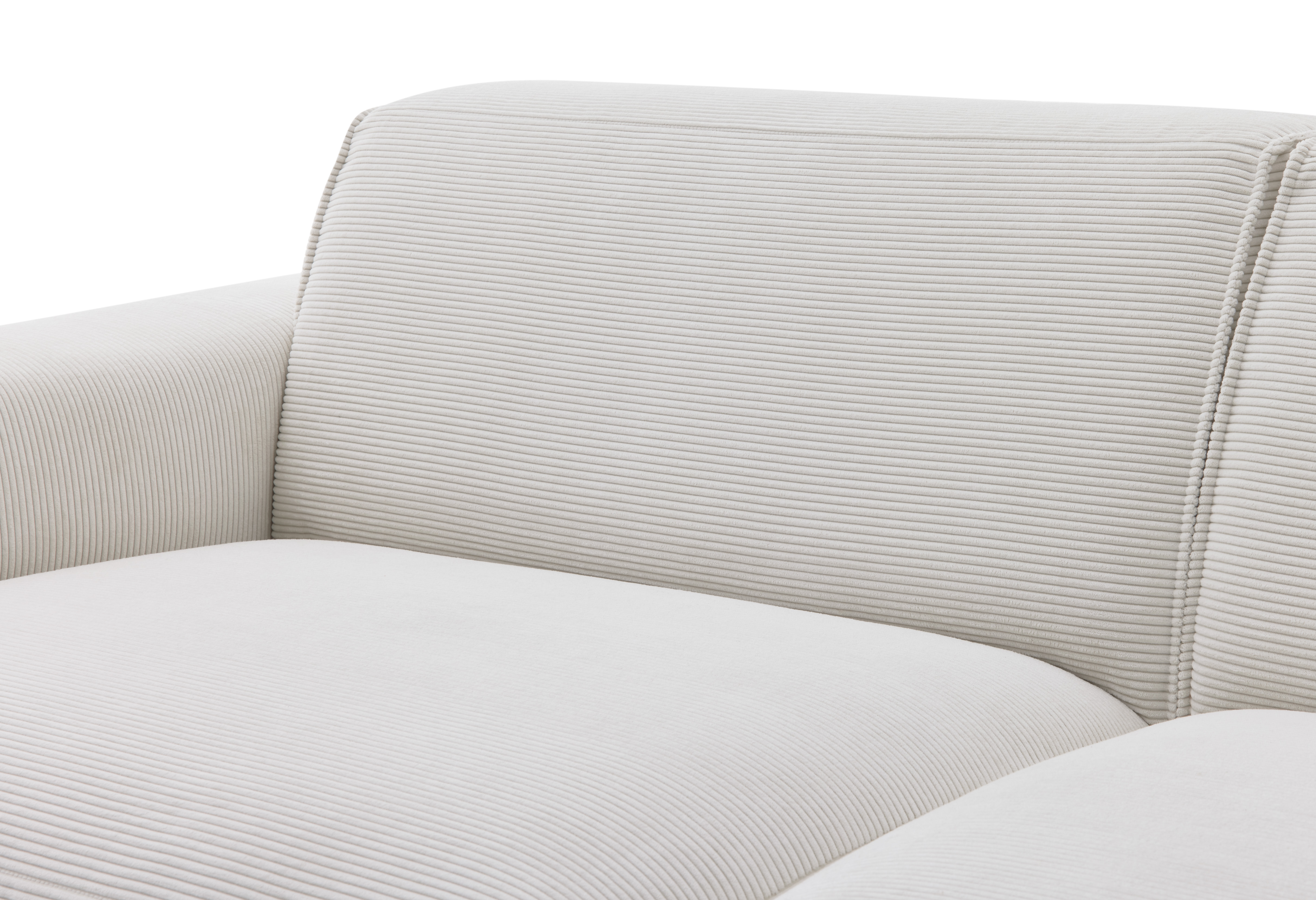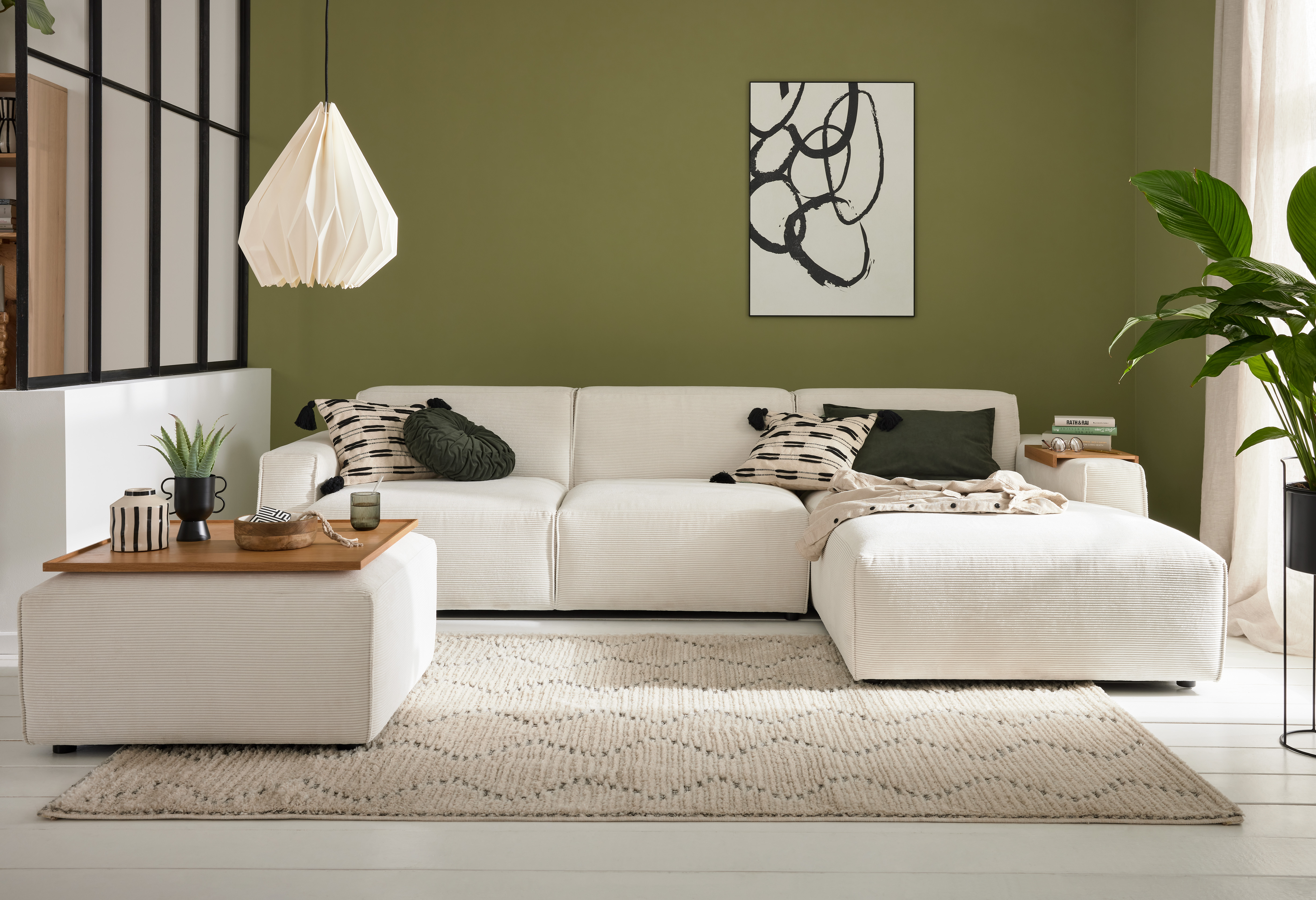 Die Polstergarnitur Roomio No. 4100 in feinem, weissen Feincord bringt frischen Schwung und zeitlose Eleganz in dein Wohnzimmer. Die komfortable Eckkombination mit 2,5-Sitzer und Ottomanen lädt zum entspannten Relaxen und geselligen Beisammensein ein. Die strapazierfähige Kaltschaumpolsterung und die praktischen Gleiter unterstreichen den modernen Look und sorgen für angenehmen Sitzkomfort. Entdecke dieses vielseitige Sofa bei Delta Möbel in Haag.
