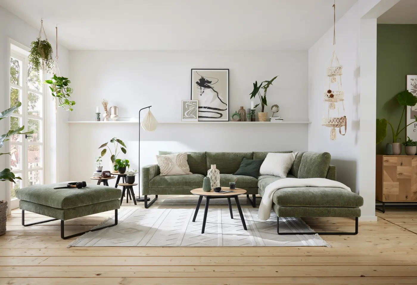 Die Polstergarnitur Roomio No. 4105 beeindruckt mit ihrem eleganten Stoffbezug Monty turtle in sanftem Grün und einem modernen Design mit schwarzen Metallkufen. Die gemütliche Eckkombination mit 2,5-Sitzer, 1-Sitzer und Abschlussteil bietet mit der Kaltschaumpolsterung angenehmen Sitzkomfort für entspannte Stunden. Ob im Wohnzimmer oder der Lounge-Ecke – dieses Sofa wird zum stilvollen Mittelpunkt. Entdecke jetzt die Polstergarnitur bei Delta Möbel in Haag.