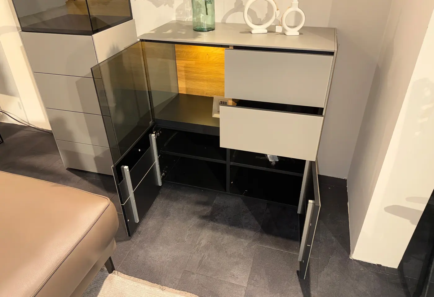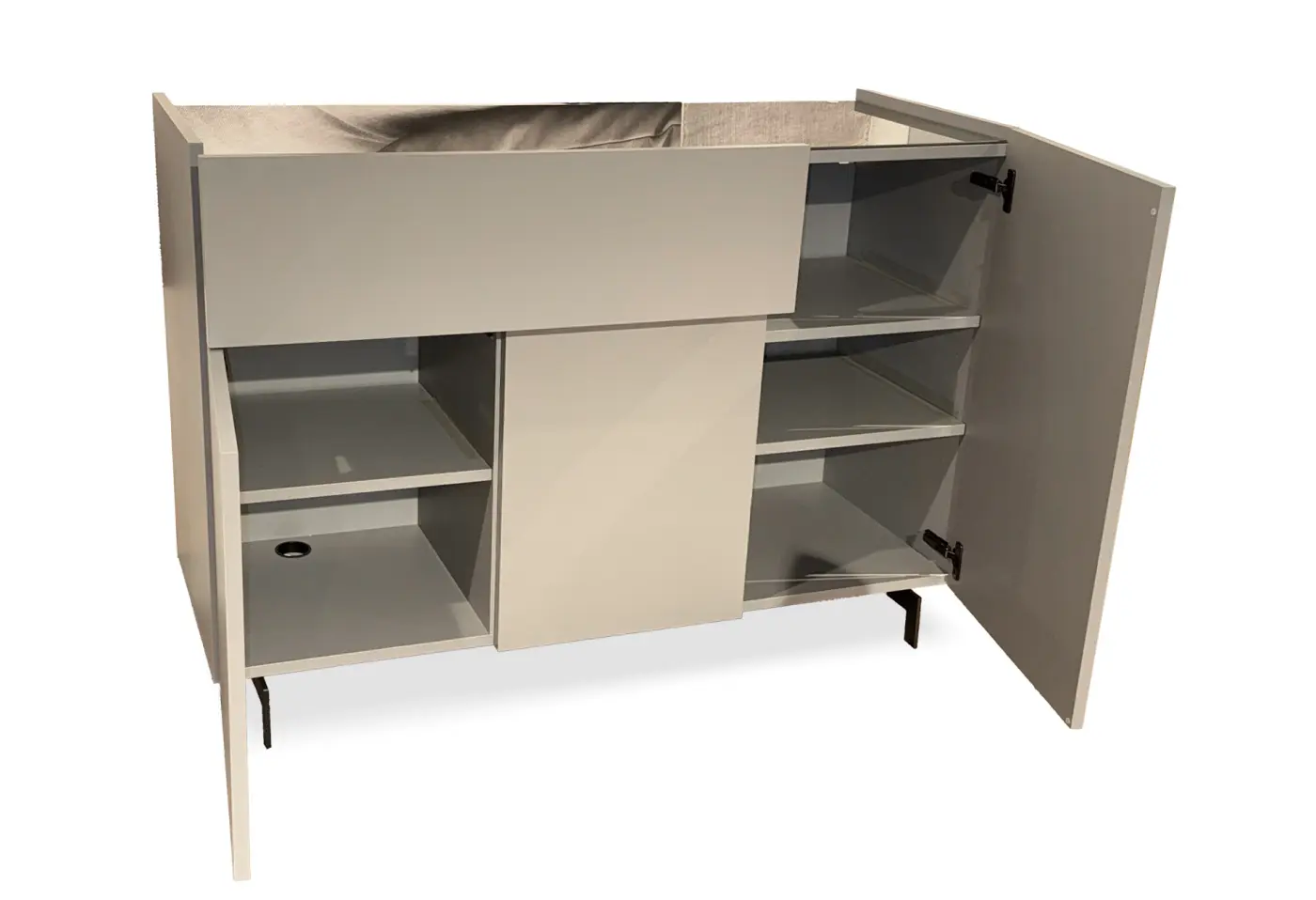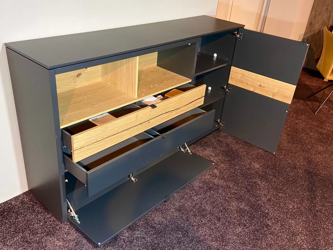 Sideboard 16923.5.. Korpus Lack matt satin moosgrau S 7005-B20G Innen Swiss CDF Dekor Farbe anthrazit ca. 160x40x43cm