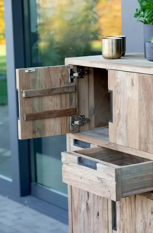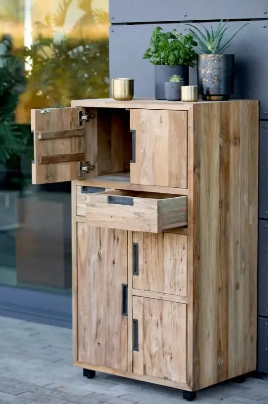 Der Schrank 13466.. aus edlem Teakholz bringt natürlichen Charme und praktische Ordnung in dein Zuhause. Mit einer Höhe von ca. 110 cm und den kompakten Maßen von 60x45 cm bietet er vielseitigen Stauraum in Form von vier Türen und zwei Schubladen. Die schwarzen Eisenfüsse und Griffe setzen einen modernen Akzent und unterstreichen das handwerkliche Design von nachhaltigem Holz aus Indonesien. Ob im Wohnzimmer, Flur oder Essbereich – dieser Schrank ist ein stilvoller Blickfang und perfekter Ordnungshelfer. Entdecke diesen hochwertigen Möbelklassiker bei Delta Möbel in Haag.