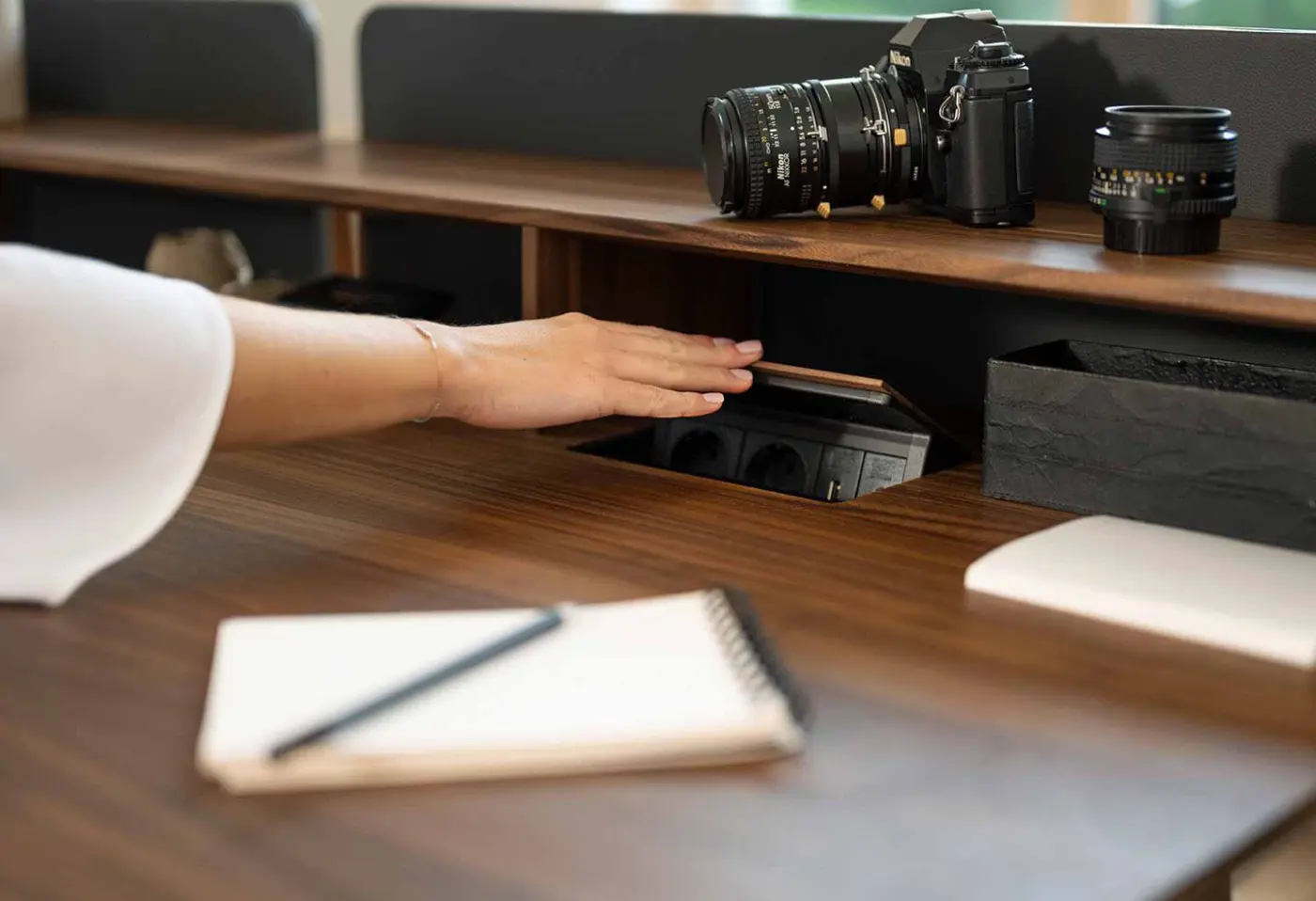 Mit pisa geht TEAM 7 einen völlig neuen Weg im Home-Office Bereich. Der aus reinem Naturholz gefertigte Schreibtisch vereint das moderne Home-Office mit natürlichem Wohngefühl. Die schräg eingebaute Hubsäule ist Designelement und innovative Technik zugleich. Sie ermöglicht eine stufenlose elektrische Höhenverstellung von 67 – 115 cm. Millimetergenau an Ihre Bedürfnisse angepasst, kann der pisa Schreibtisch im Sitzen oder im Stehen genutzt werden. Bilder und Pinnwände an der Wand sind kein Hindernis, denn die Tischplatte bewegt sich beim Hochfahren automatisch leicht nach vorne.&edsp;