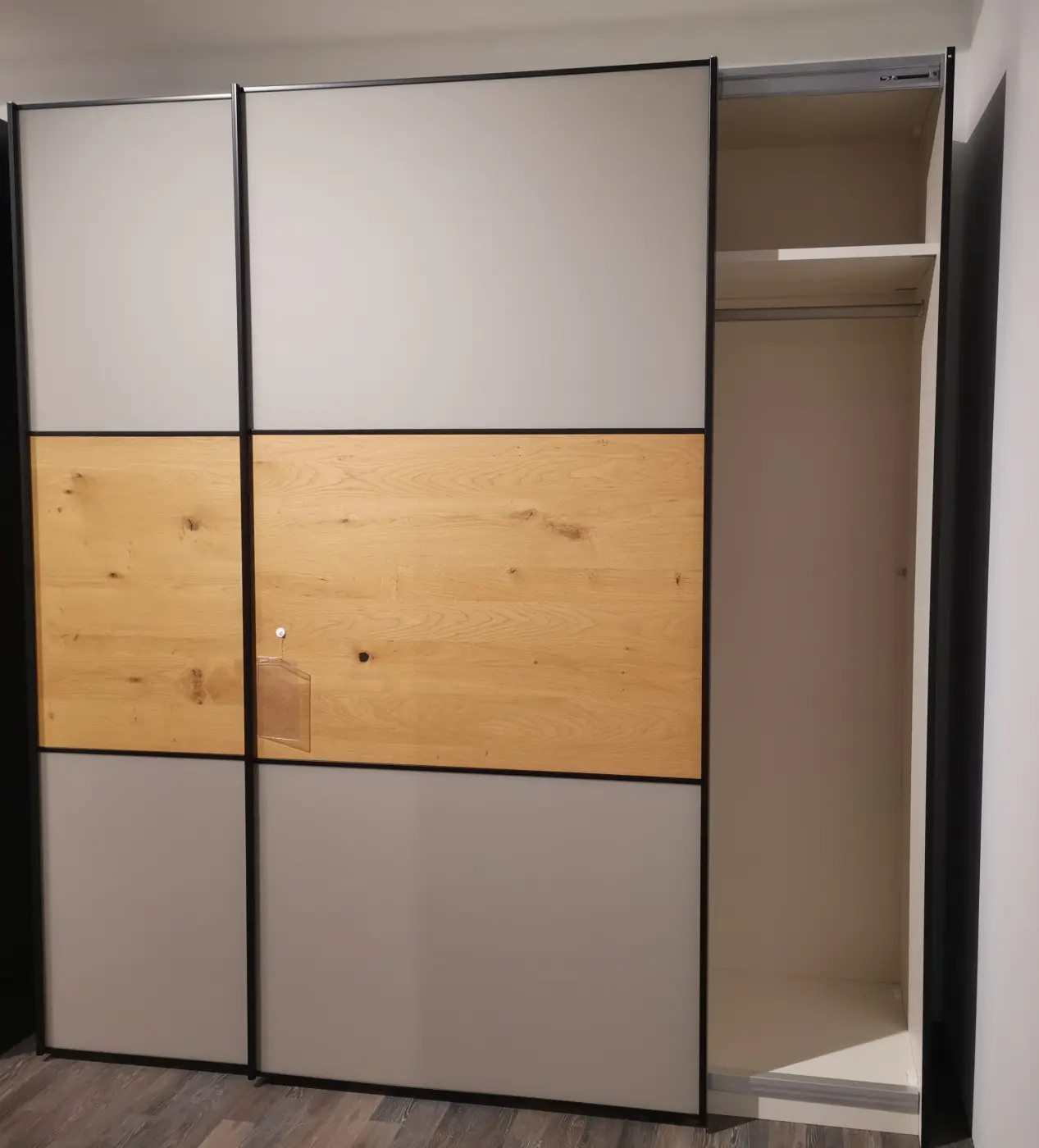 Der Schwebetürenschrank 20885 vereint modernes Design mit natürlicher Eleganz und bringt mit seinem matt schwarzen Novaschwarz und dem warmen Nougat-Glas eine trendige Note in jedes Schlafzimmer. Die mittlere Front aus furnierter Eiche setzt dabei einen charmanten Kontrast und verleiht dem Schrank eine besondere Ausstrahlung. Mit seinen grosszügigen Massen bietet er viel Stauraum und passt dank des schwarzen Aufclipprofils wunderbar zu unterschiedlichen Raumstilen. Ob als großzügiger Kleiderschrank oder Ordnungshelfer – dieser Schwebetuerenschrank macht Ihr Schlafzimmer zum Wohlfühlort. Entdecken Sie dieses und viele weitere stilvolle Möbel bei Delta Möbel in Haag, Ihrem Experten für Möbel und Einrichtung.