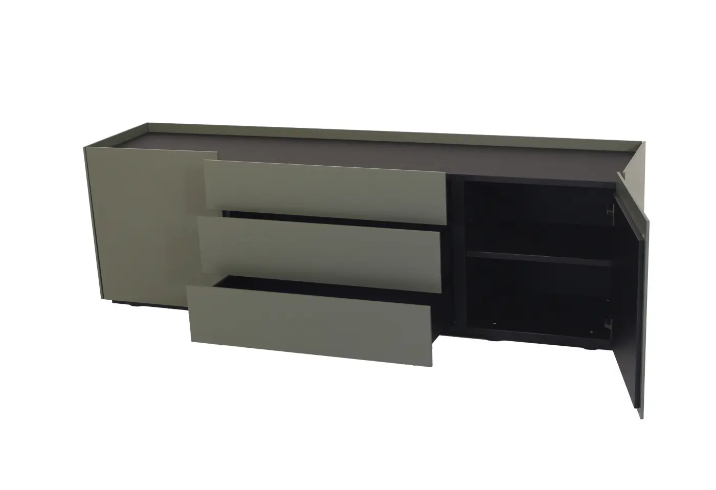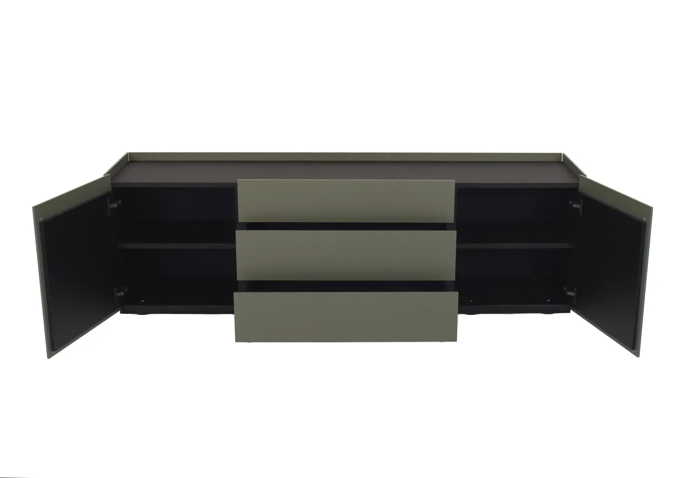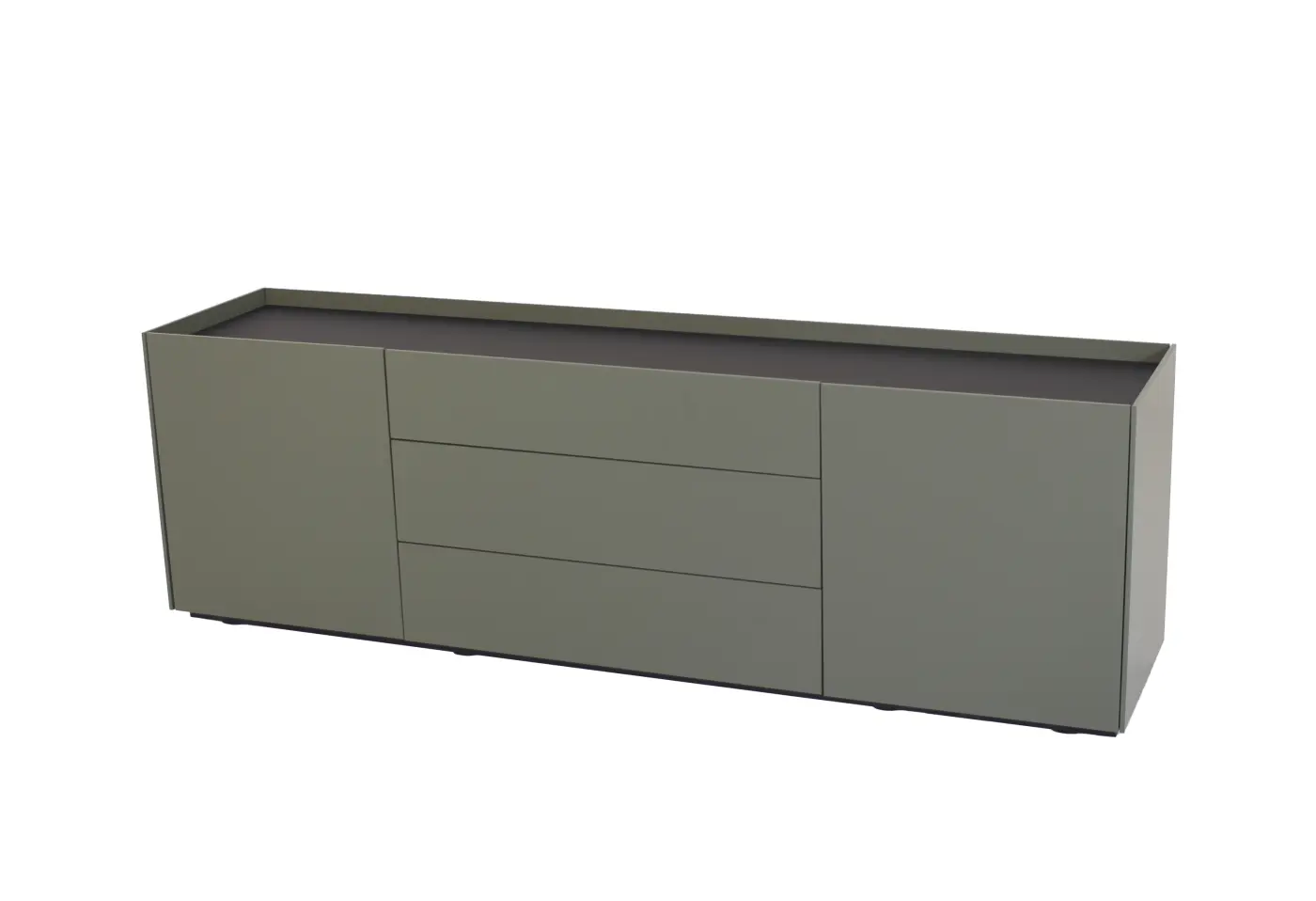 Dieses moderne Sideboard besticht durch seine matt lackierte Oberfläche in Lorbeergrün, die dem Möbelstück eine elegante und zeitgemäße Note verleiht. Mit einer Breite von ca. 180 cm und einer Höhe von 54,4 cm bietet es praktischen Stauraum durch zwei Drehtüren mit je einem Tablar und drei geräumigen Schubladen. Die klare Formensprache und das hochwertige Melaminmaterial sorgen für ein langlebiges und ansprechendes Design. Perfect für stilbewusste Wohnräume – verfügbar bei Delta Möbel in Haag, deinem Experten für hochwertige und funktionale Möbel.