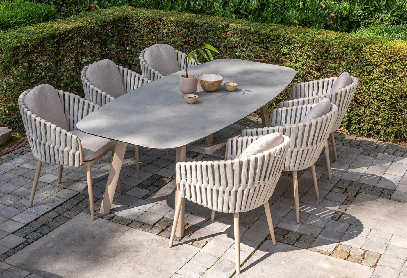 Die Tischgarnitur Rope Keramik bringt mit ihrer Kombination aus natürlicher Eleganz und modernem Design-Stil auf Ihre Terrasse oder in den Garten. Der langlebige Keramiktisch in edlem Latten-Farbton bietet mit seinen ca. 240 x 103 cm viel Platz für gemütliche Runden. Die bequemen Stühle mit robustem Aluminiumgestell und weichem Seilbezug schaffen ein wohnliches Ambiente und inklusive zwei bequemen Kissen beladen sie zum entspannten Verweilen ein. Entdecken Sie diese exklusive Gartenmöbelgarnitur bei Delta Möbel in Haag – Ihrem Fachhändler für hochwertige Möbel, Küchen und Boutique-Artikel.
