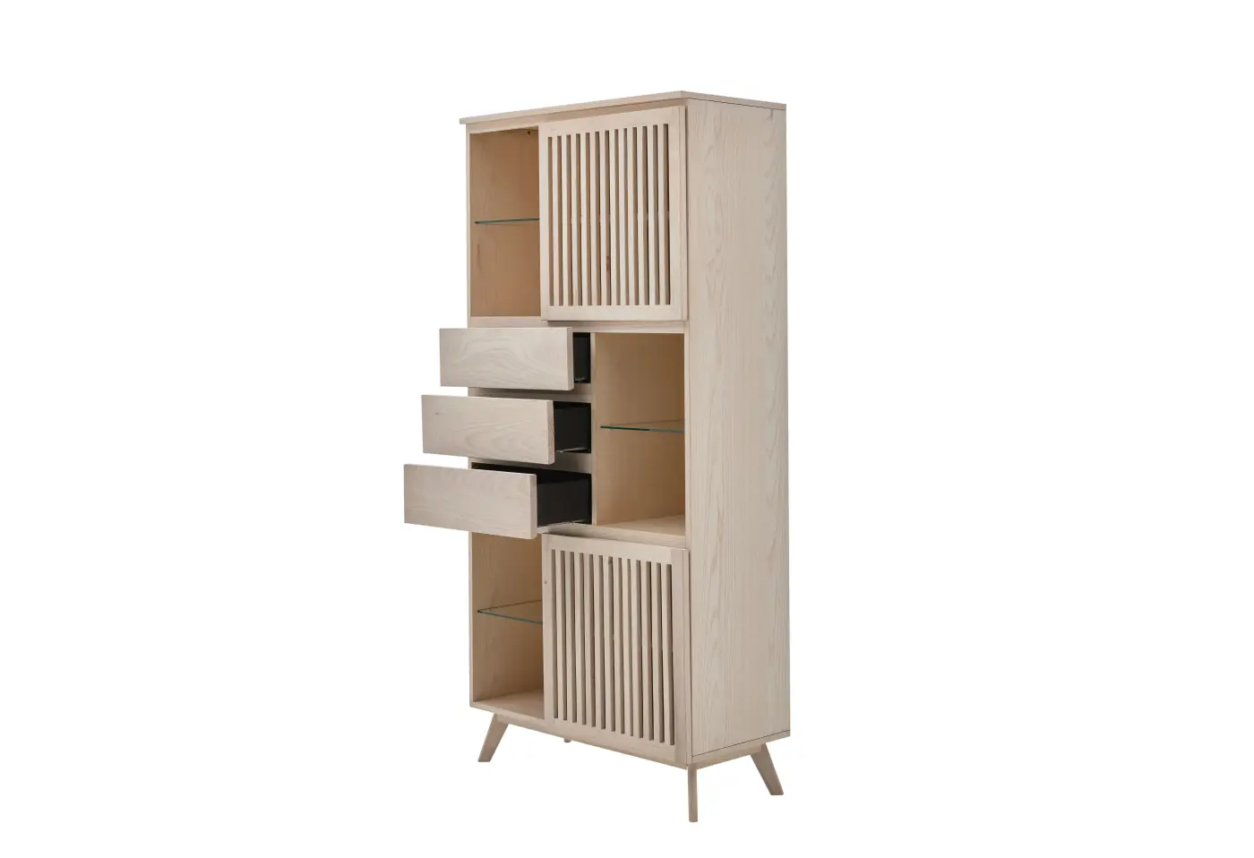 Vitrine Roomio No. 2000 von Roomio Korpus Echtholzfurnier weiss gewaschen, Front Esche massiv weiss geschwaschen/Türfüllungen hinterlegt mit Klarglas ca. 85x180x40cm