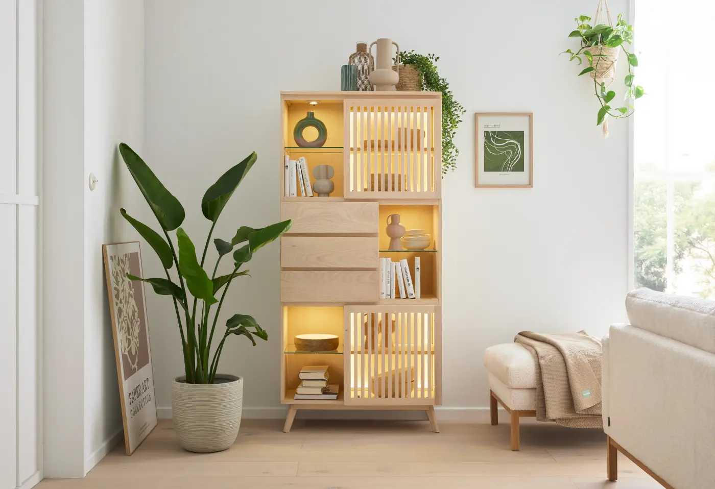 Die moderne Vitrine beeindruckt mit ihrem hellen, weiss gewaschenen Esche-Furnier und der hochwertigen Verarbeitung aus massivem Holz. Mit einer Höhe von ca. 180 cm, einer Breite von ca. 85 cm und einer Tiefe von ca. 40 cm bietet sie ein perfekt aufgeteiltes Stauraumkonzept mit Glastüren, Schubladen und praktischen Abstellflächen. Die soft-close Funktion und integrierte Beleuchtung sorgen für Komfort und eine stimmungsvolle Präsentation Ihrer Lieblingsstücke. Dieses hochwertige Möbelstück aus nachhaltiger Holzherkunft aus Indien ist ein echtes Highlight in jedem Wohnraum. Entdecken Sie es bei Delta Möbel in Haag – Ihrem Experten für Möbel, Küchen und Boutique-Artikel.